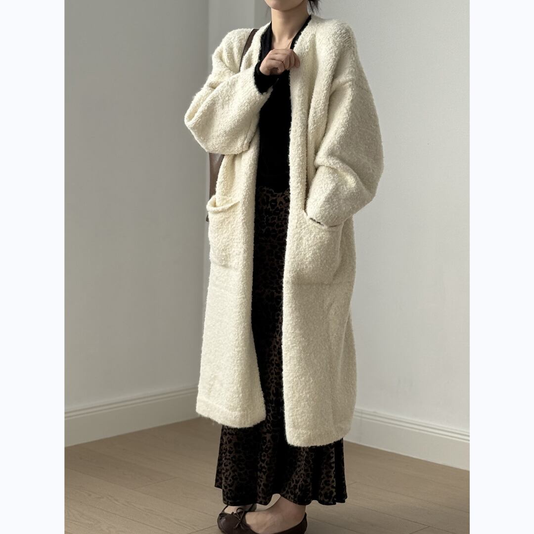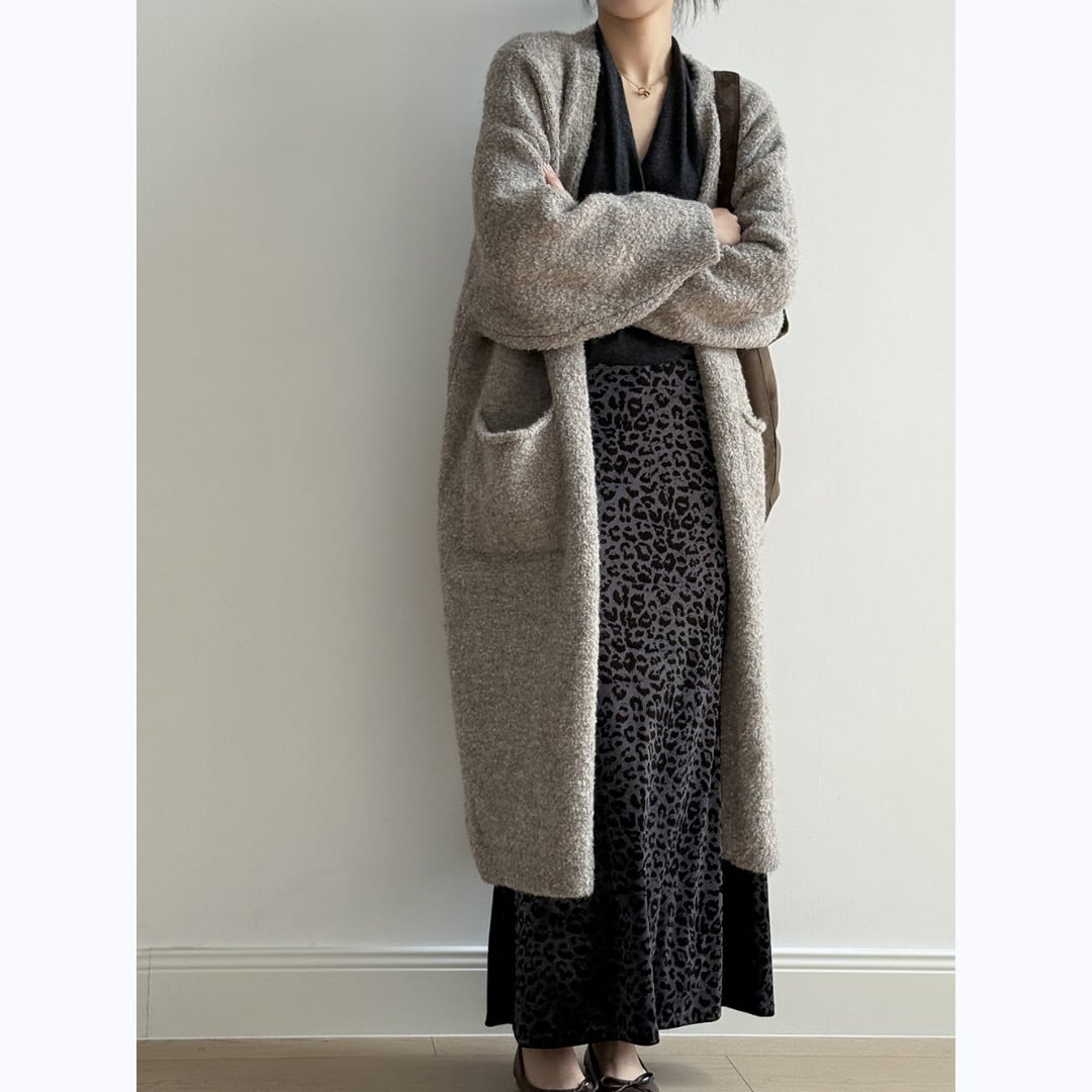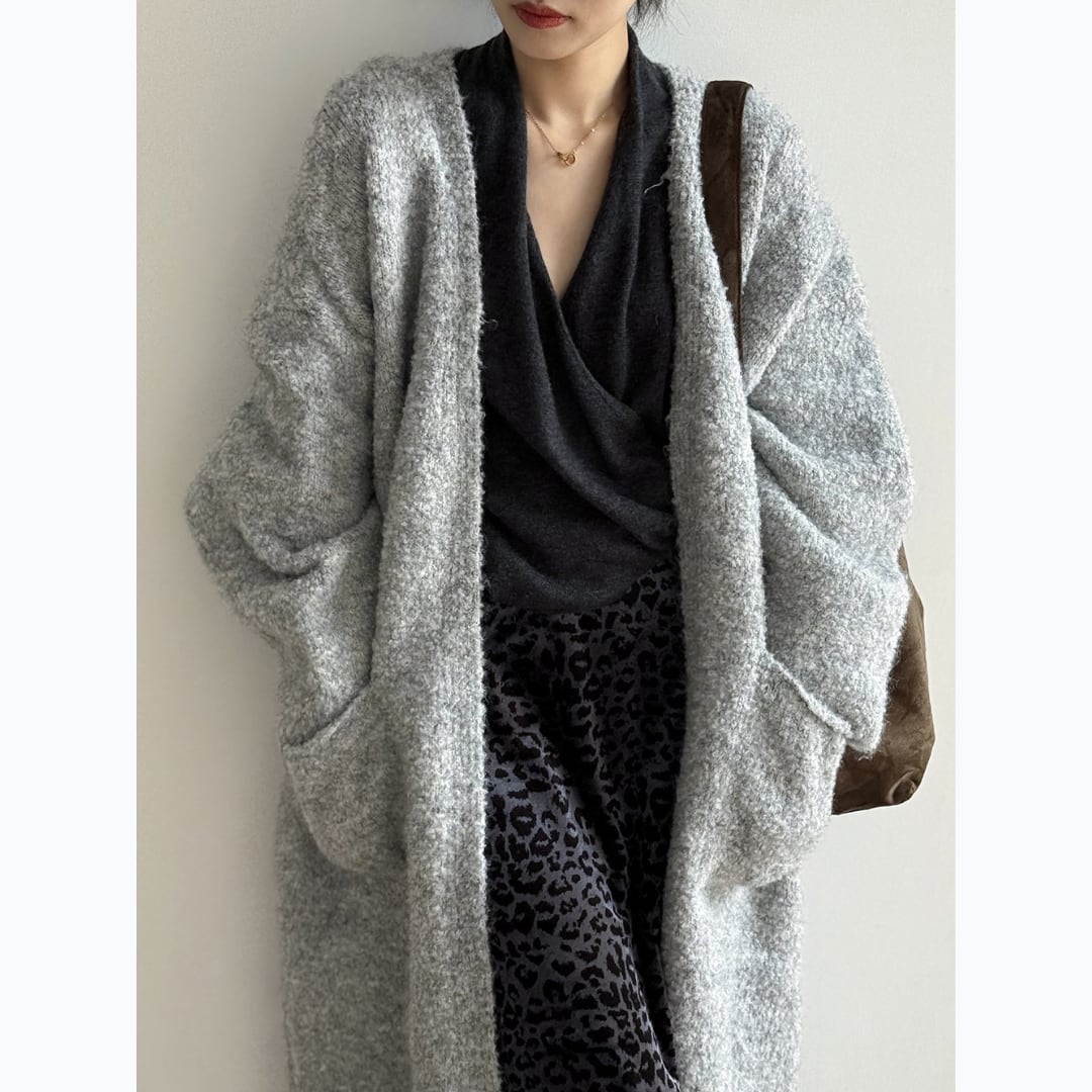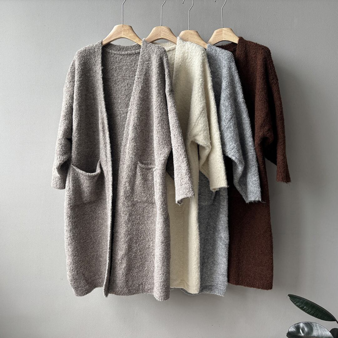 ほどよいゆるさとロング丈のバランスが大人っぽい、ポケット付きロングニットカーディガン。