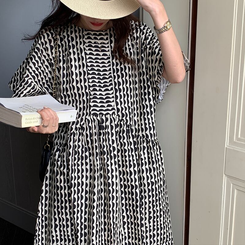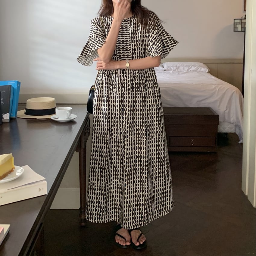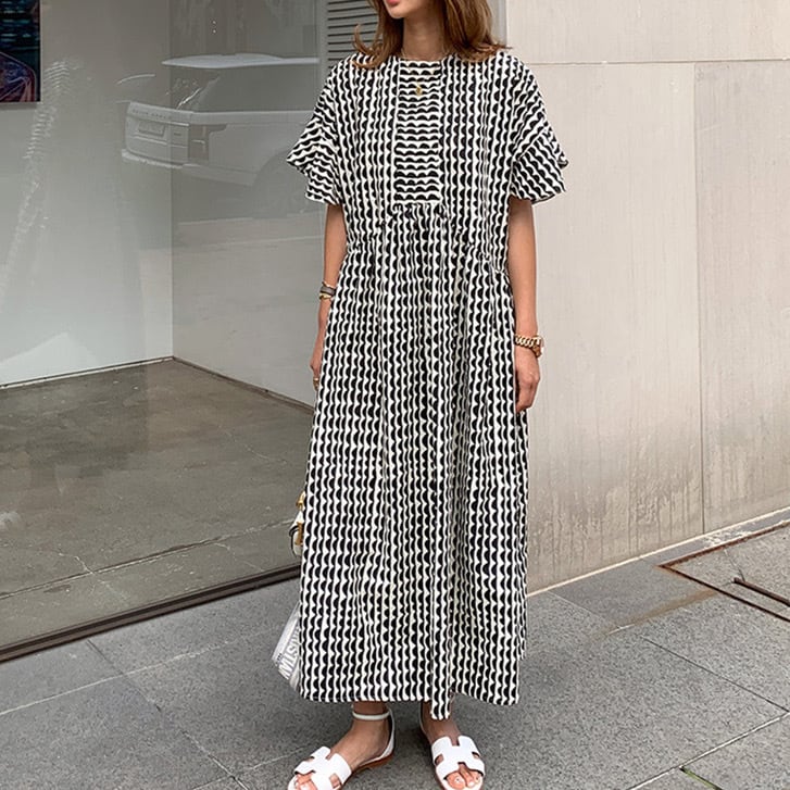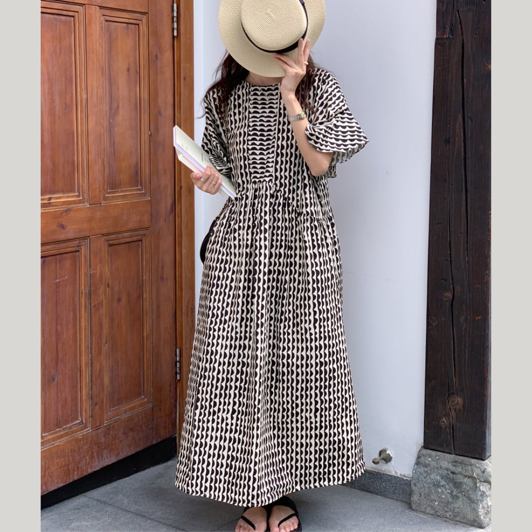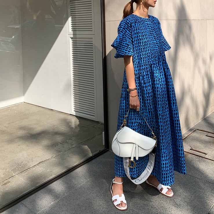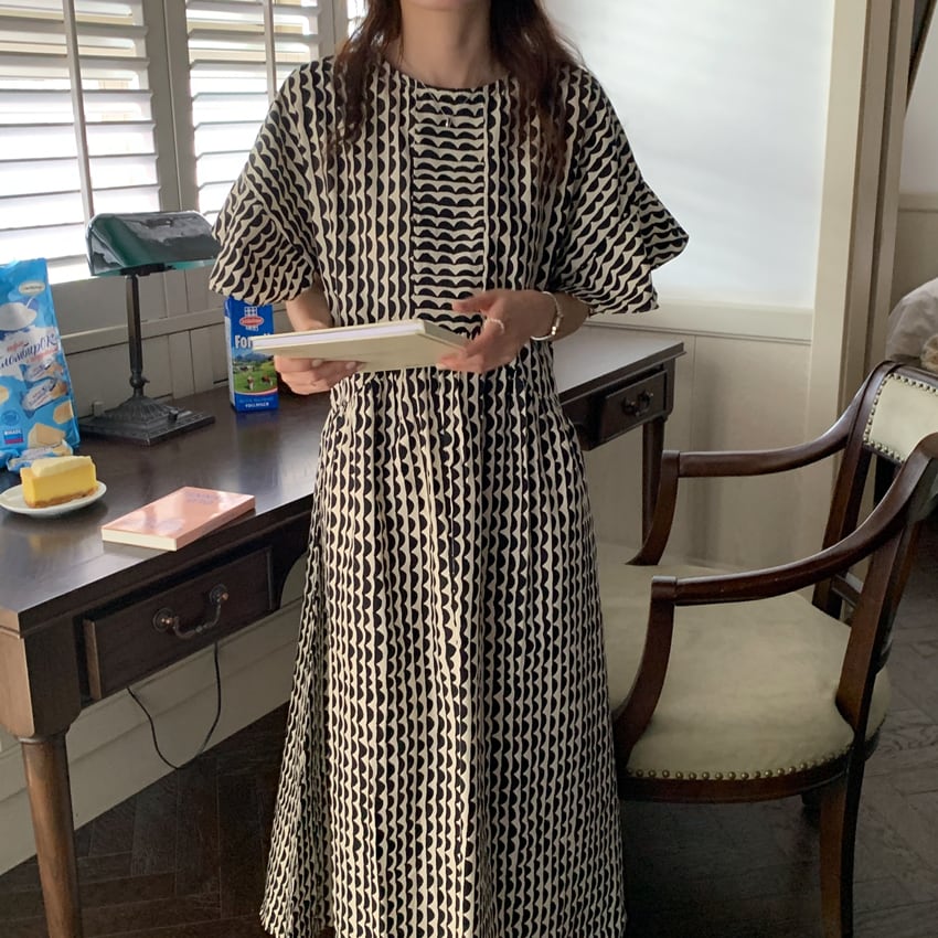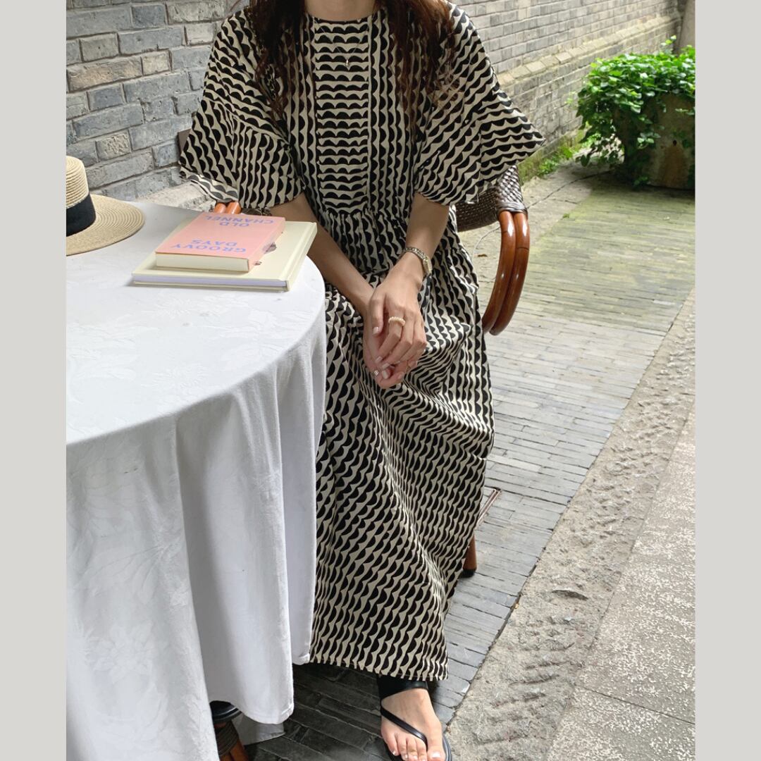 幾何学な柄がスタイルに映えるロングワンピースです。