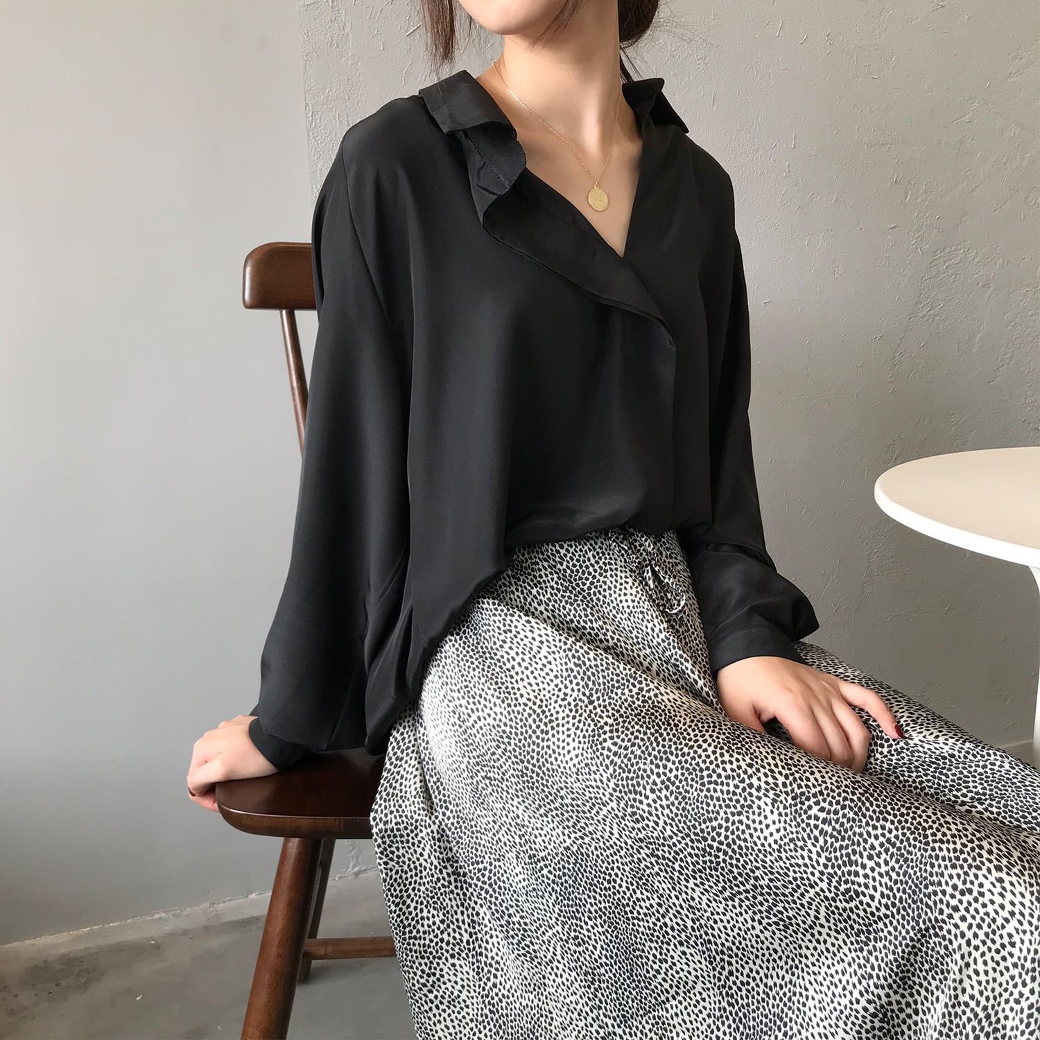 シックな印象を底上げするカラー使いと歩くたびに目を惹く細やかな柄使いがポイント。