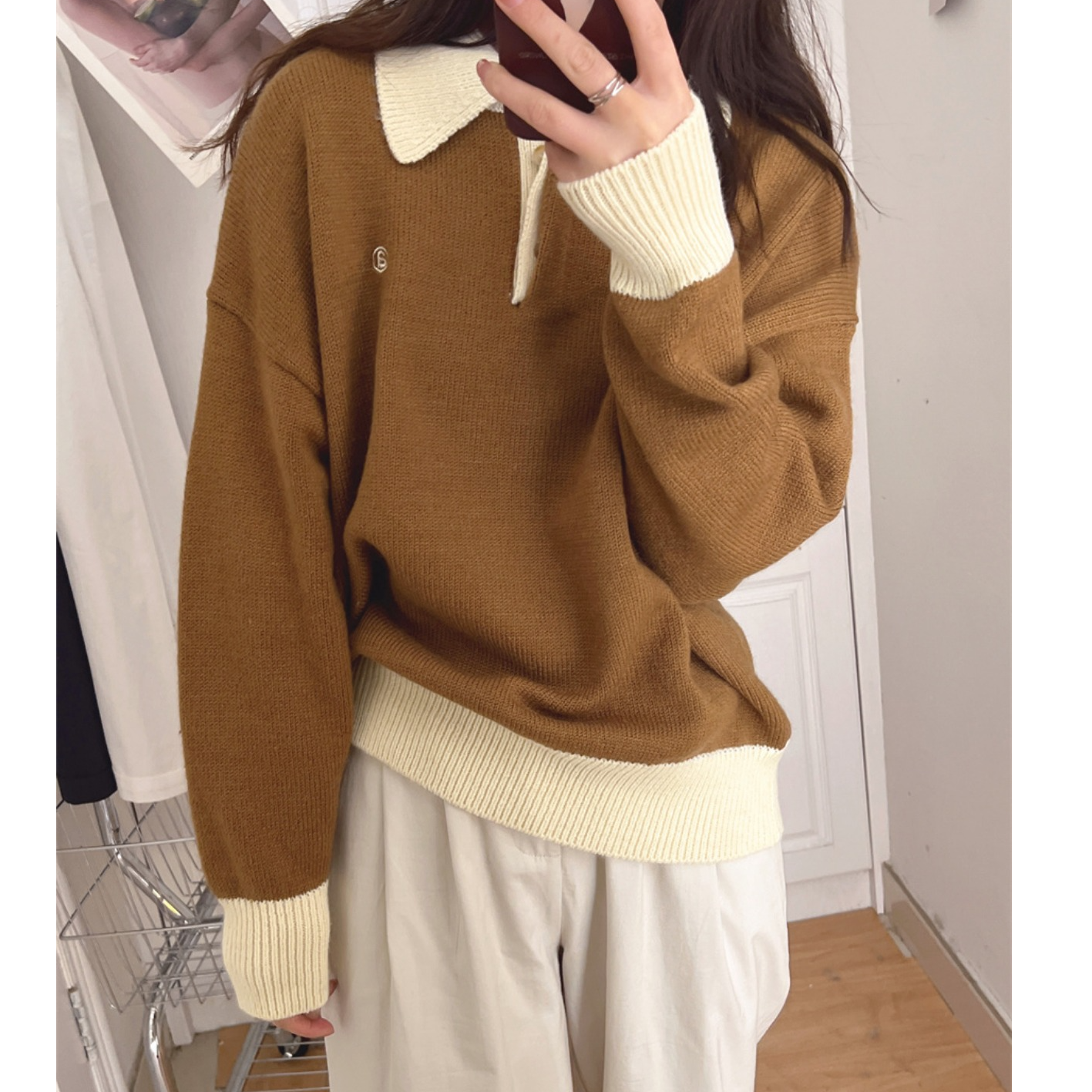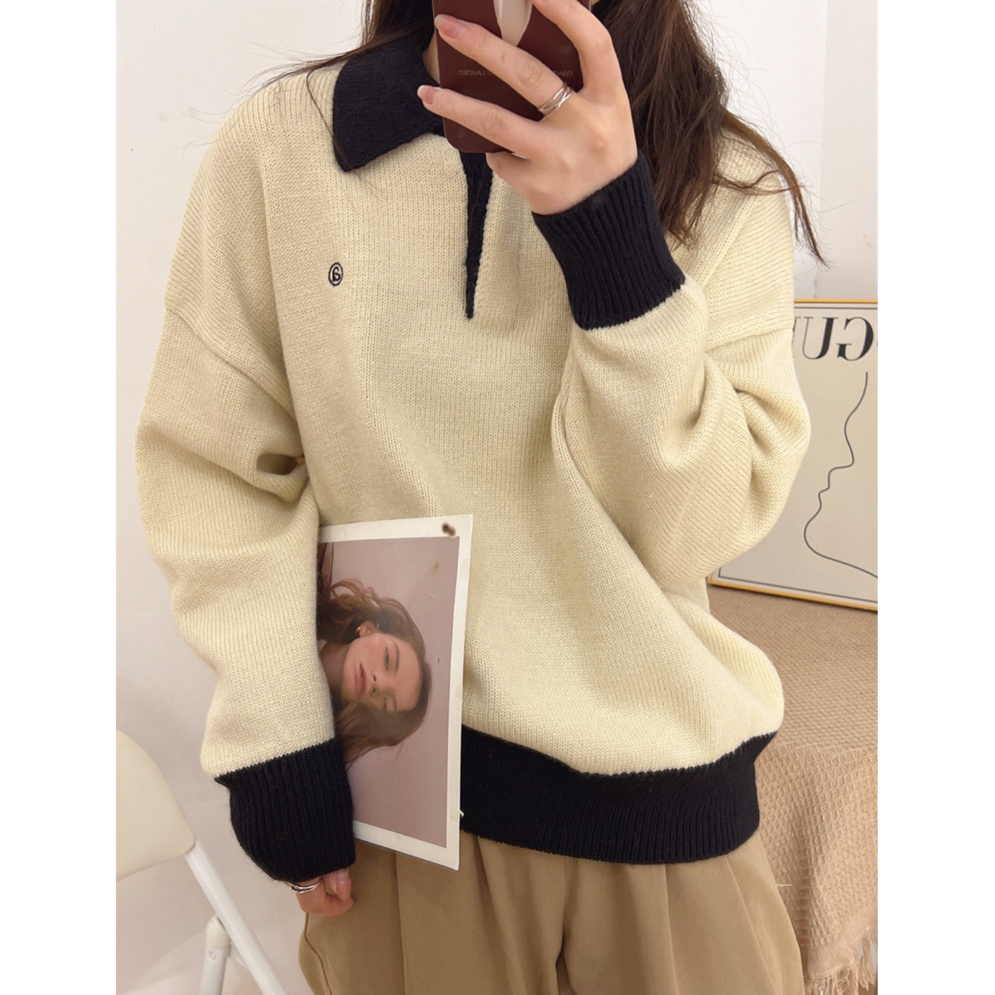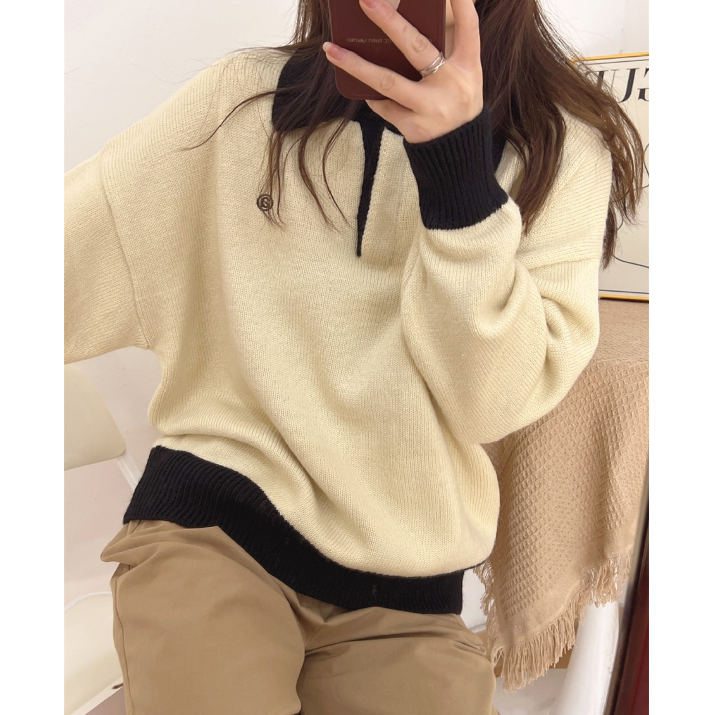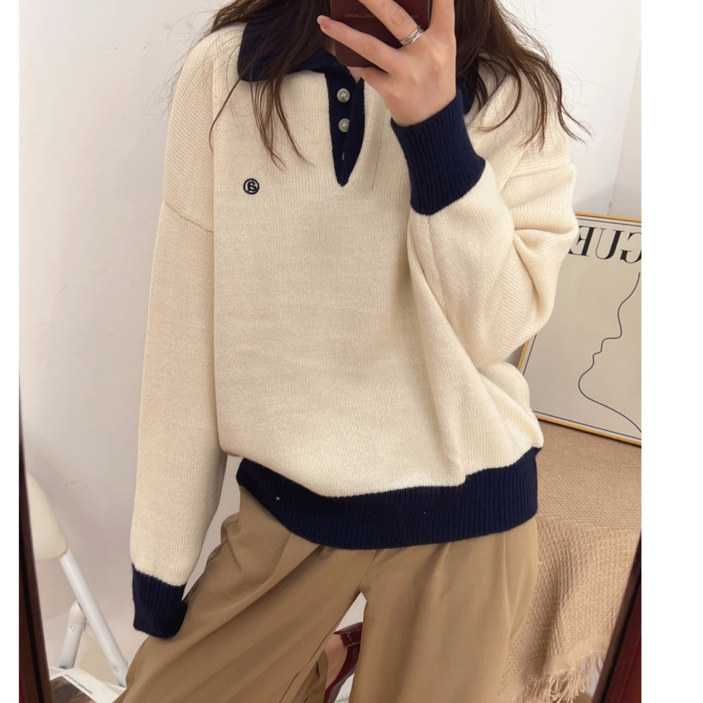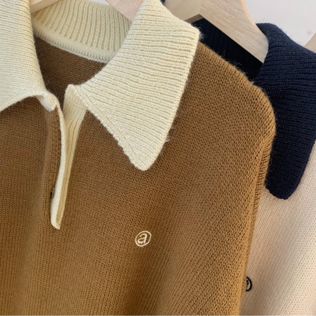 バイカラー切り替えがおしゃれなポロカラーニット。