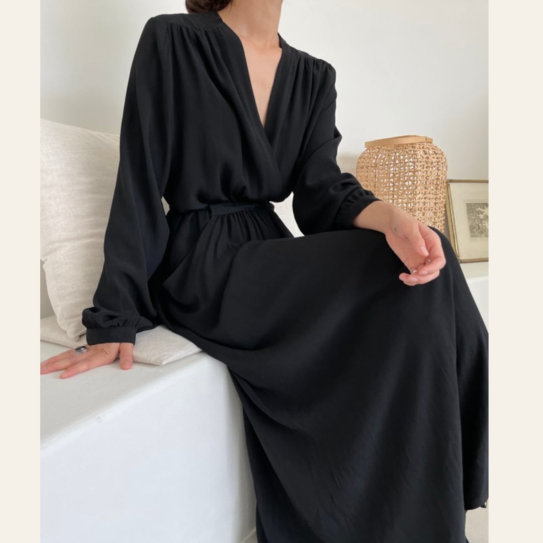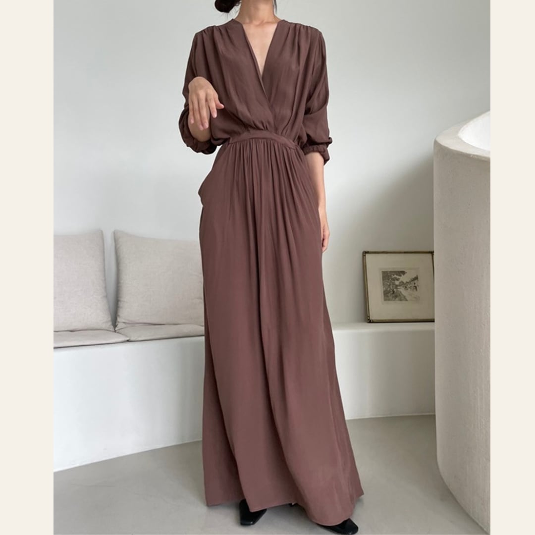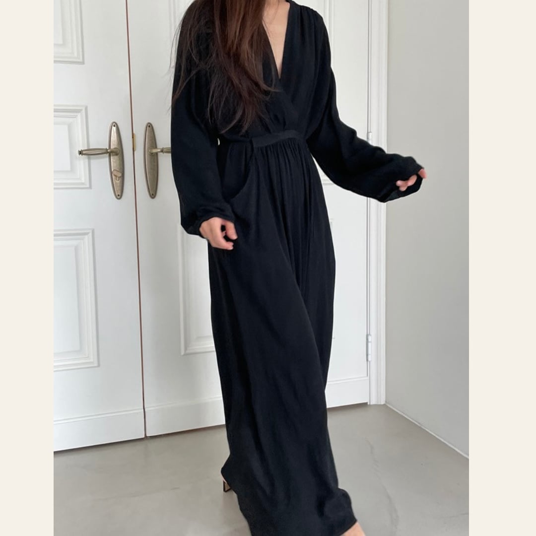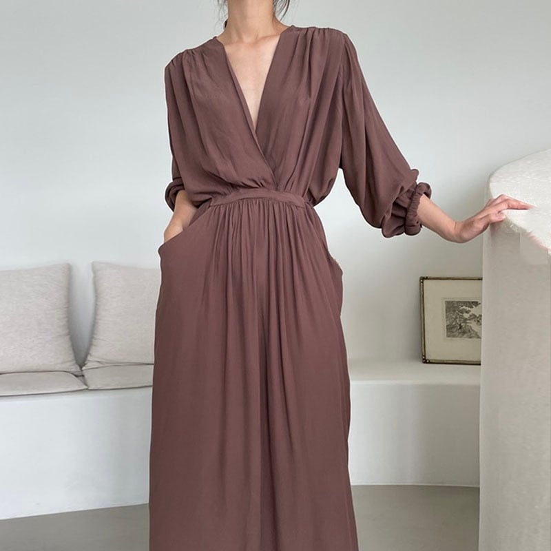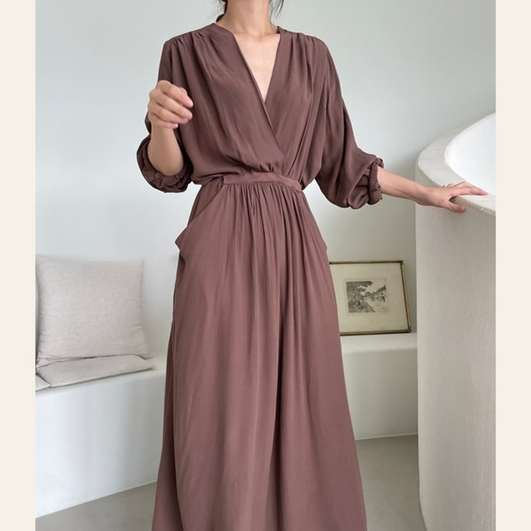 ディープVネックでこなれた雰囲気を醸し出すロングワンピース。