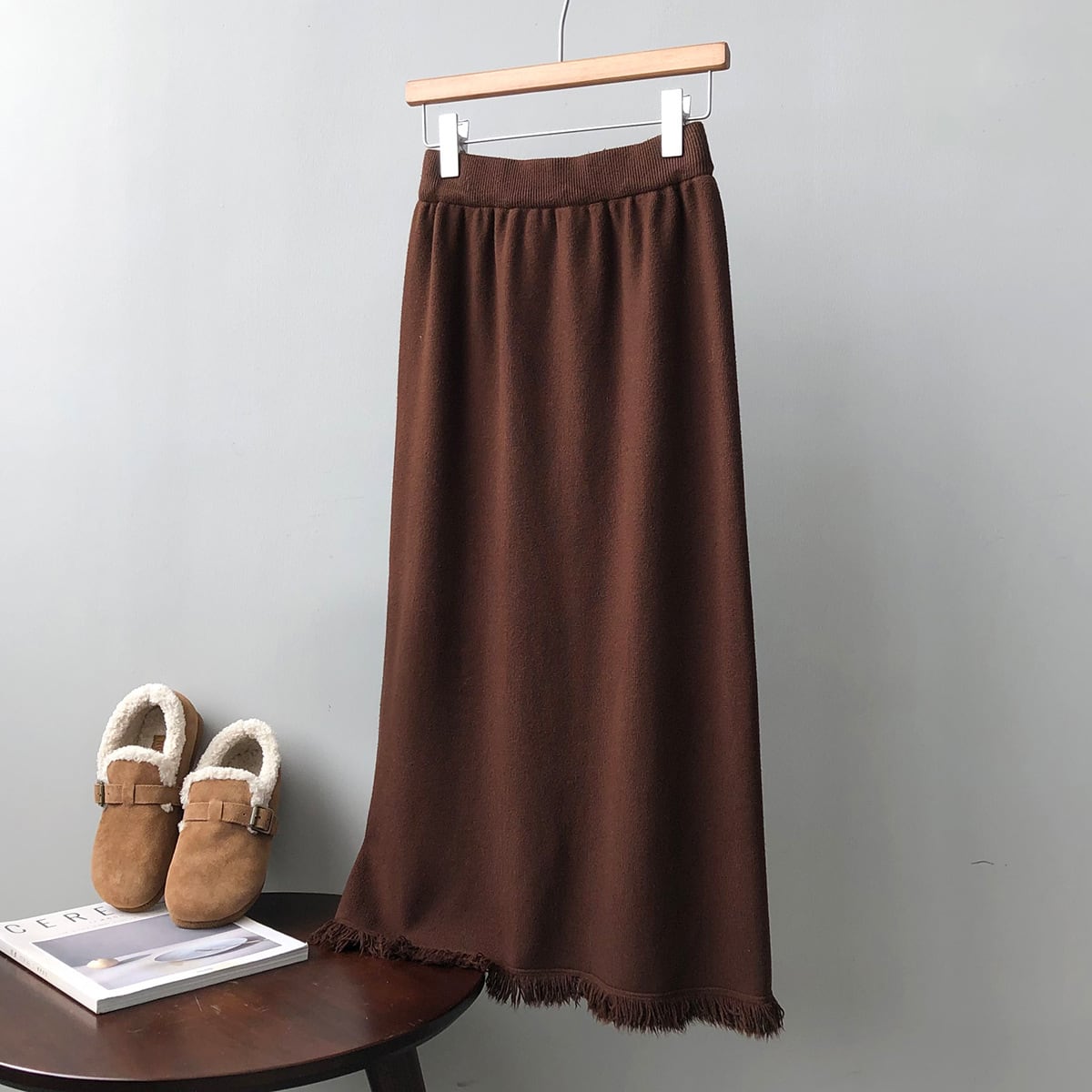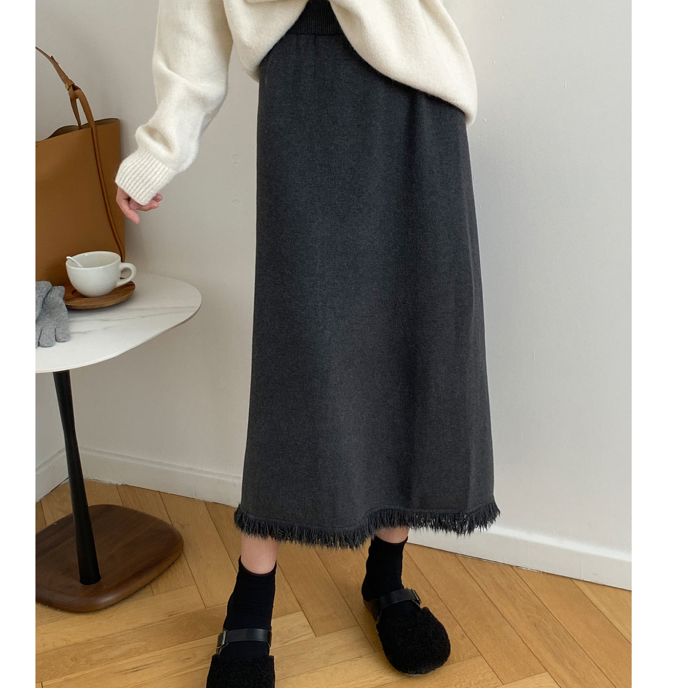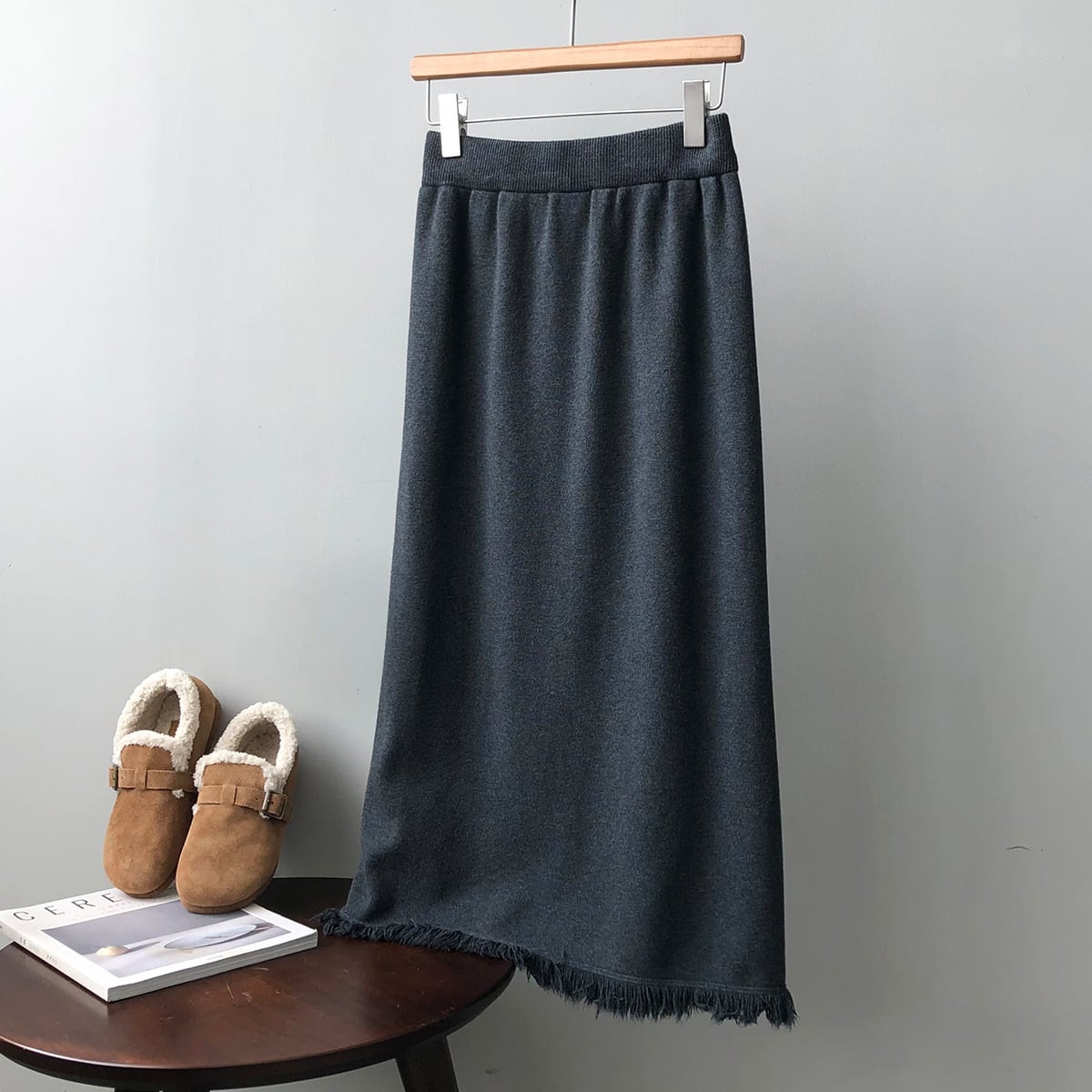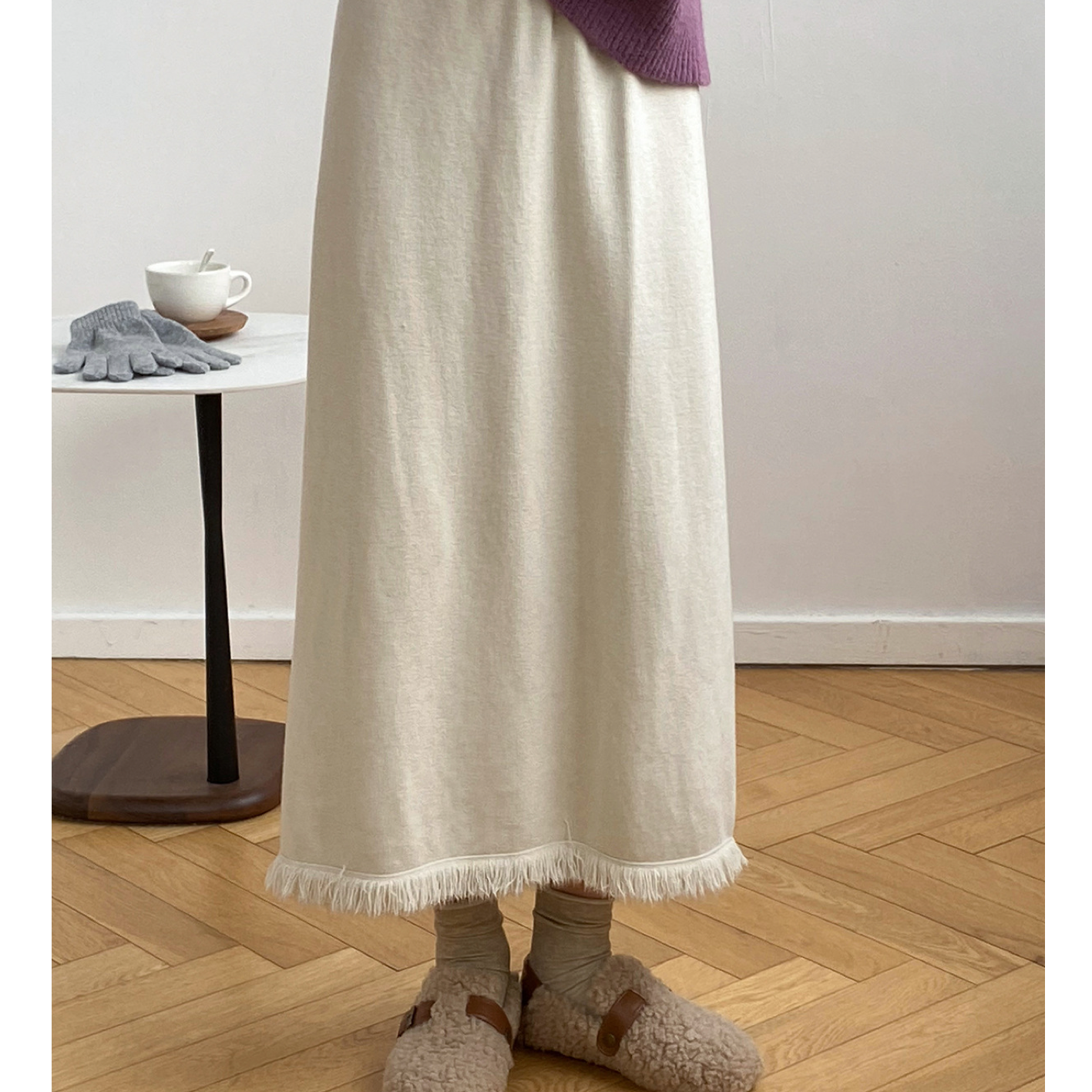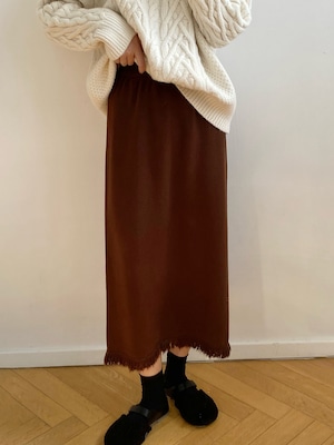 フリンジカットで仕上げたペンシルラインのスカートです。