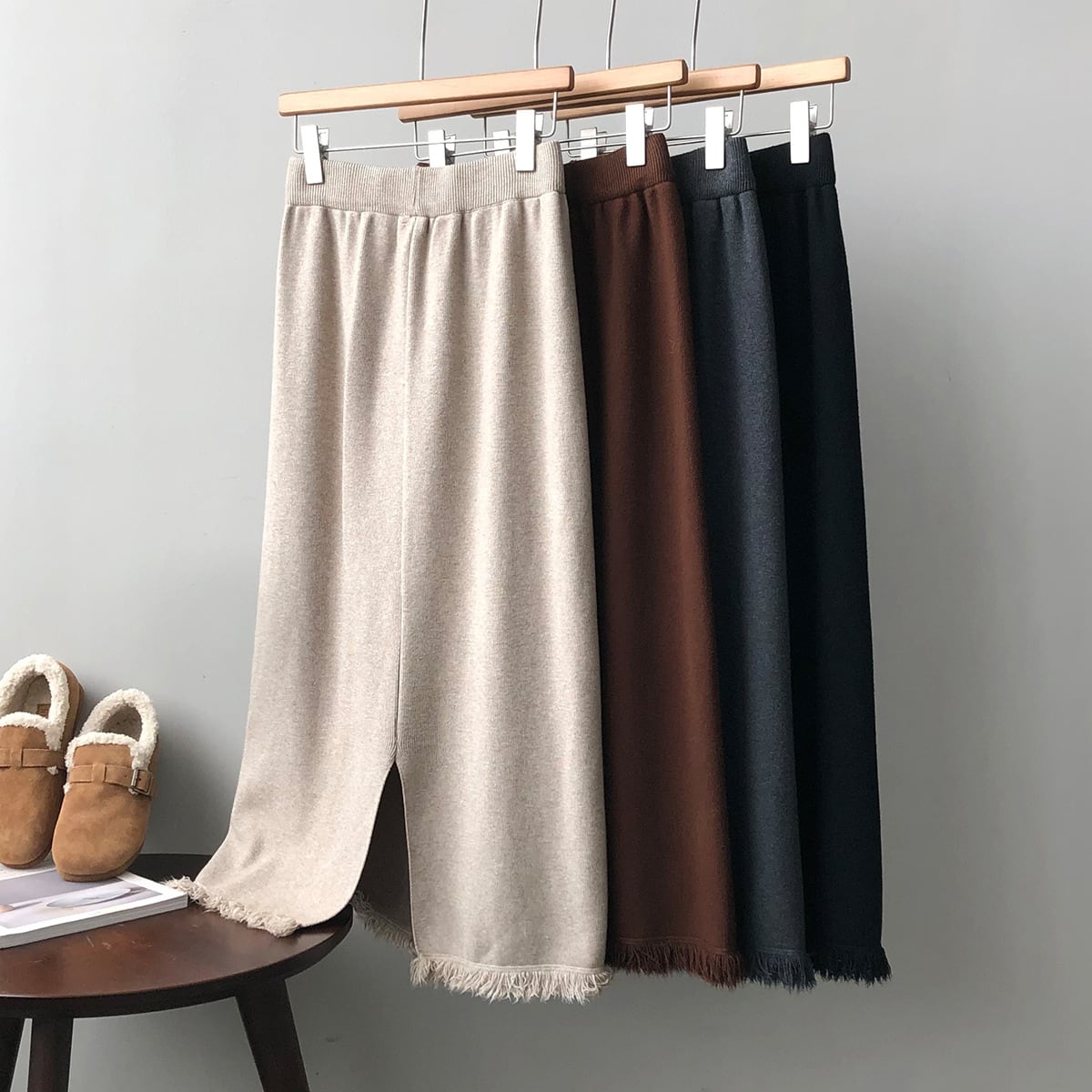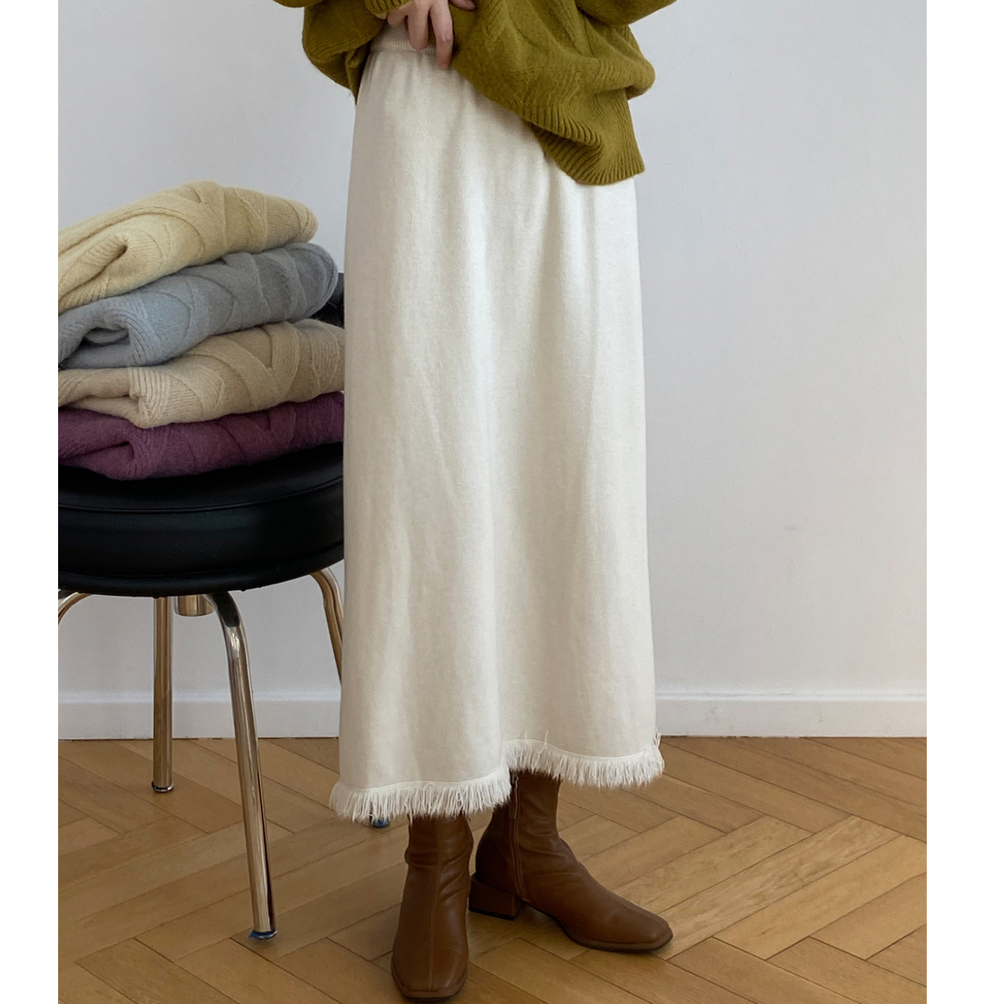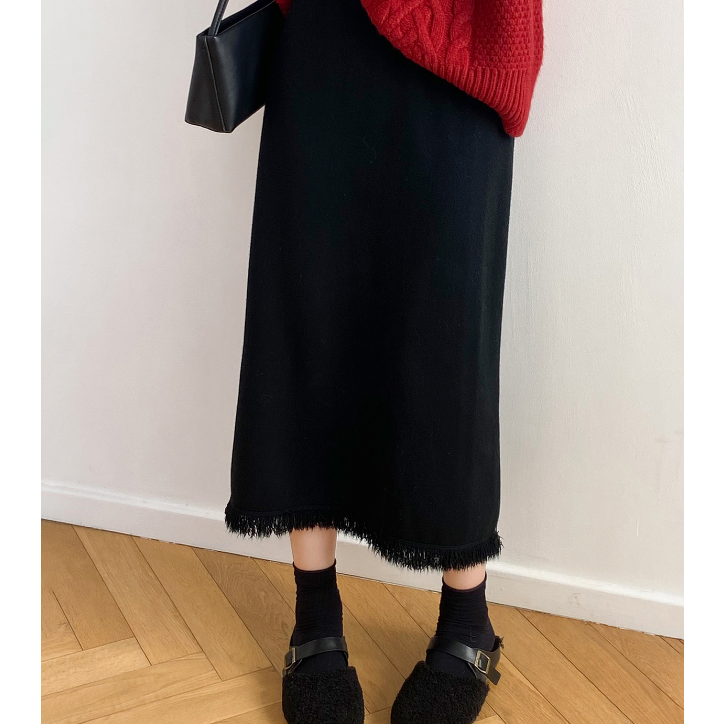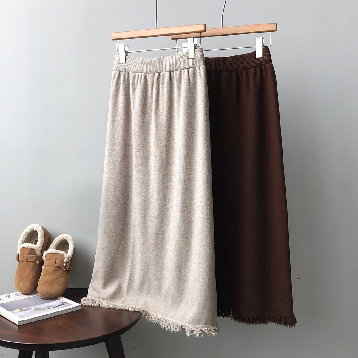 フリンジカットで仕上げたペンシルラインのスカートです。