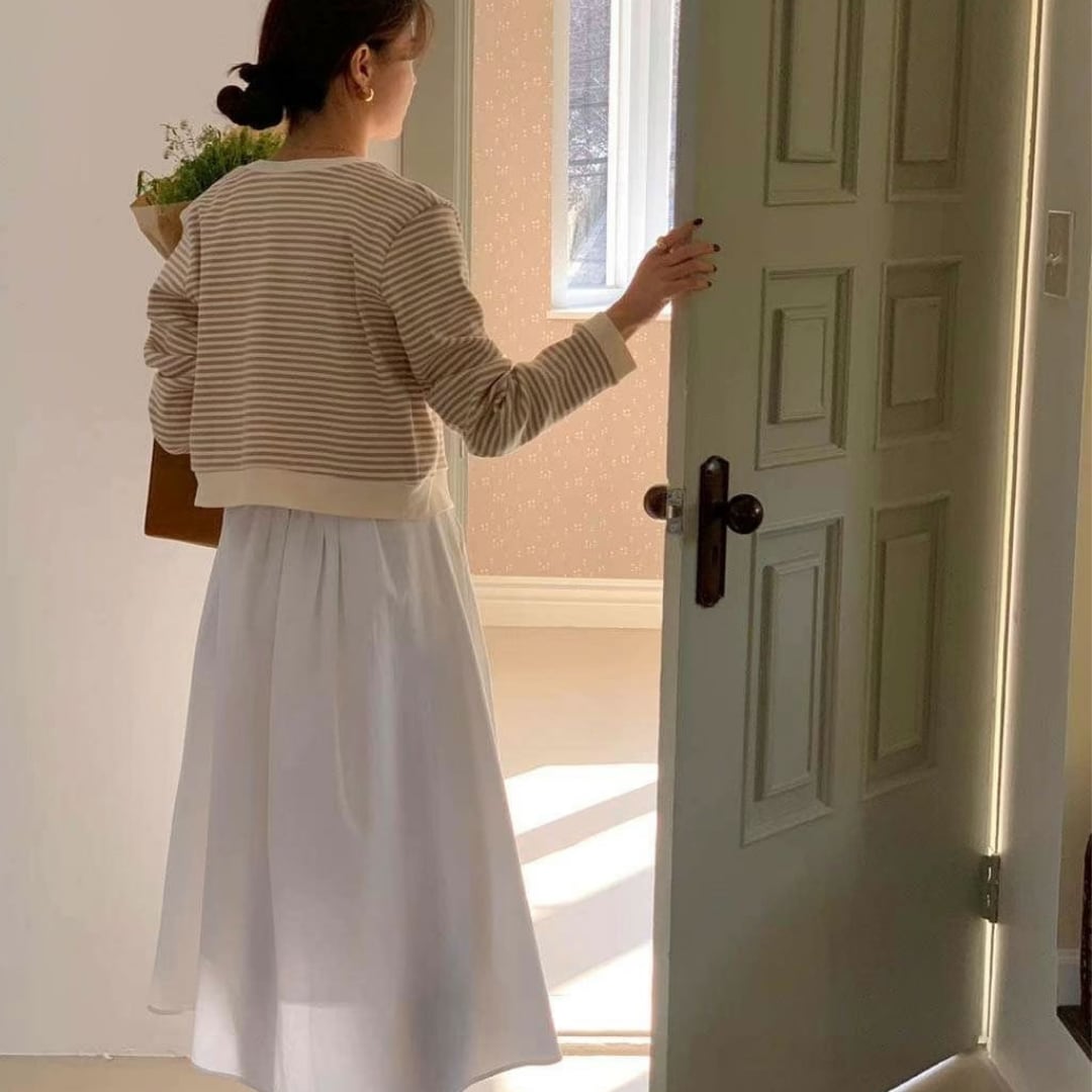 細かなストライプ柄が、大人の女性らしい落ち着きある印象を与えます◎