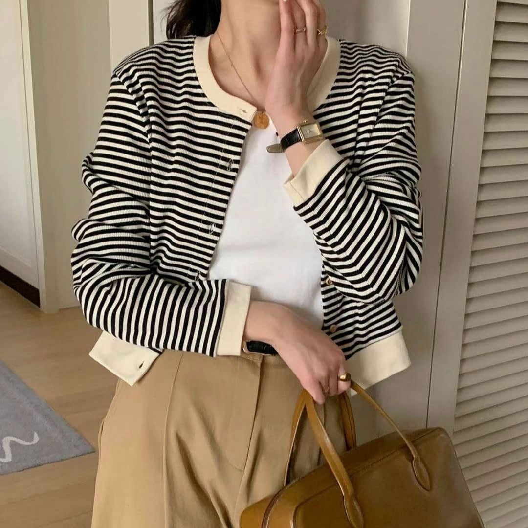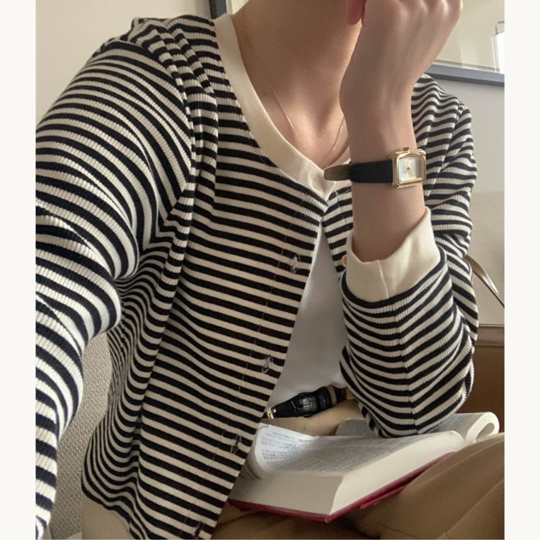 シンプルと上品さを兼ね備えたノーカラー細ストライプカーディガン。