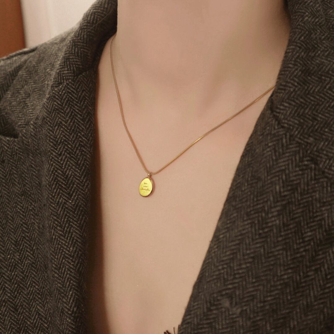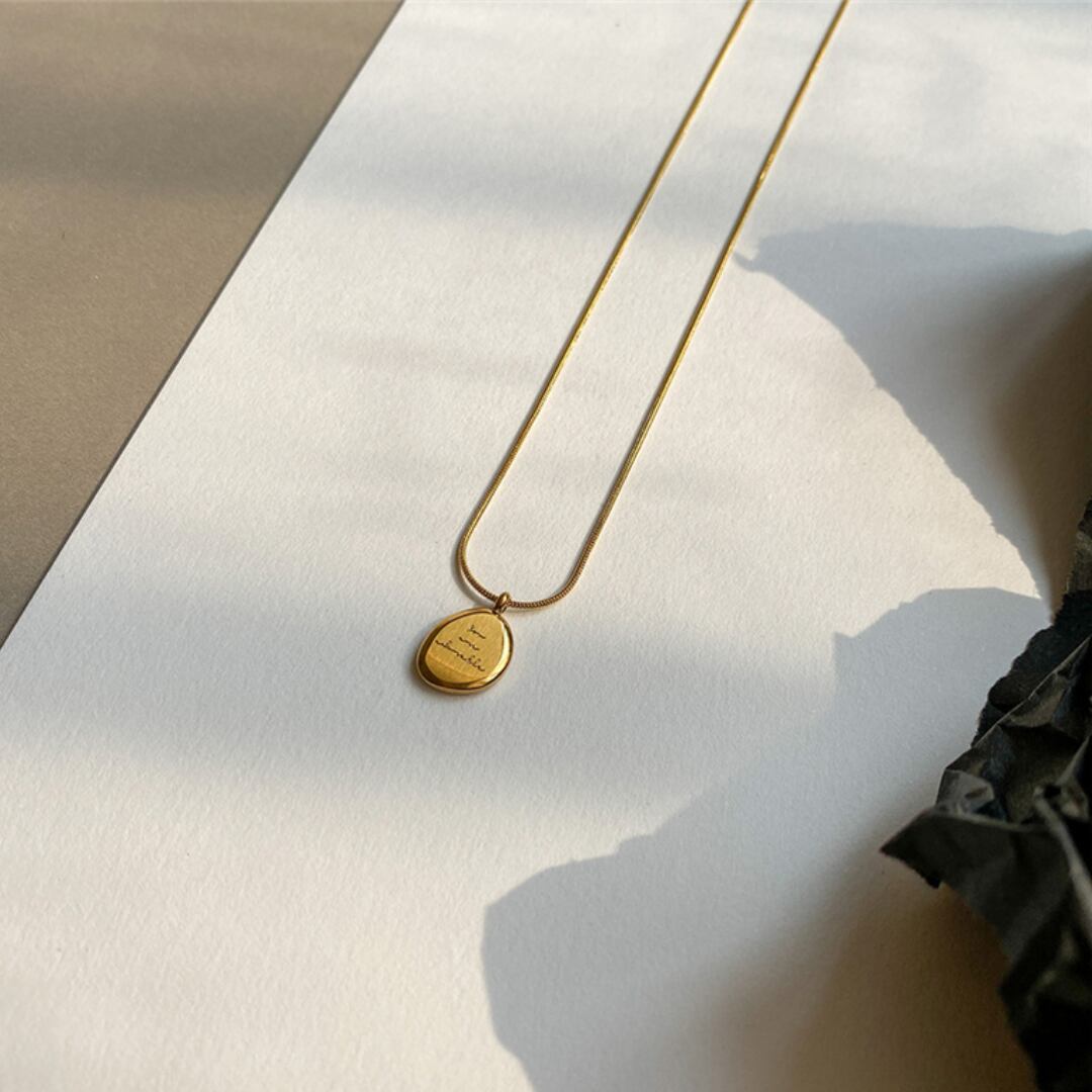 英字彫刻入りのペンダントトップをあしらったネックレス。