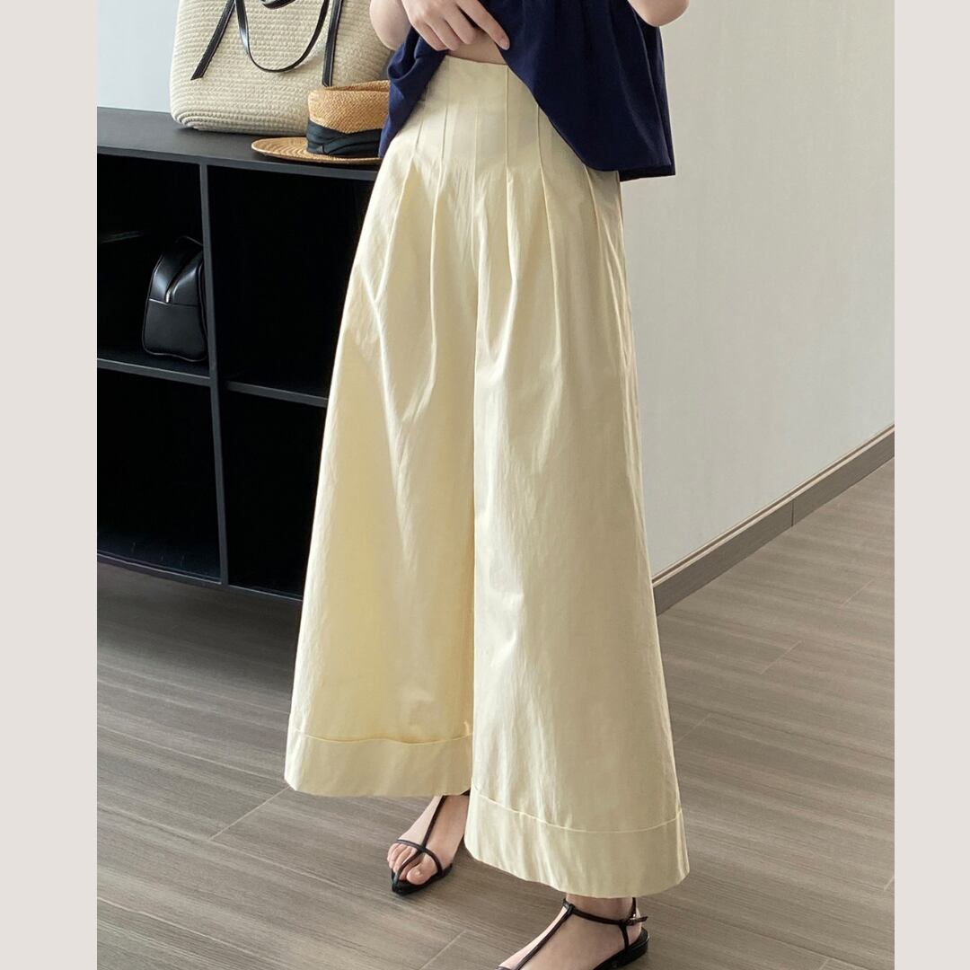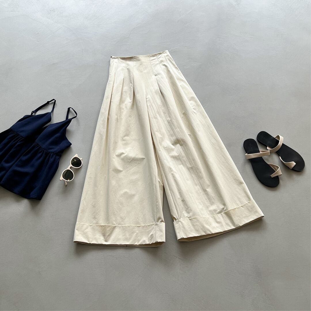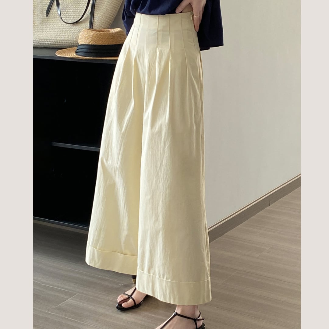 アイボリーのシンプルな無地デザインで履きまわしやすく、長めの丈とワイドなシルエットで、体型カバー効果も抜群です◎