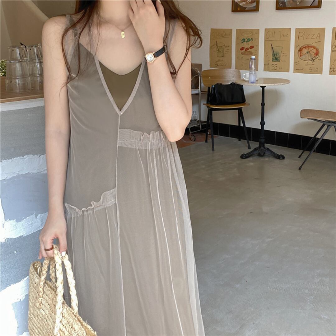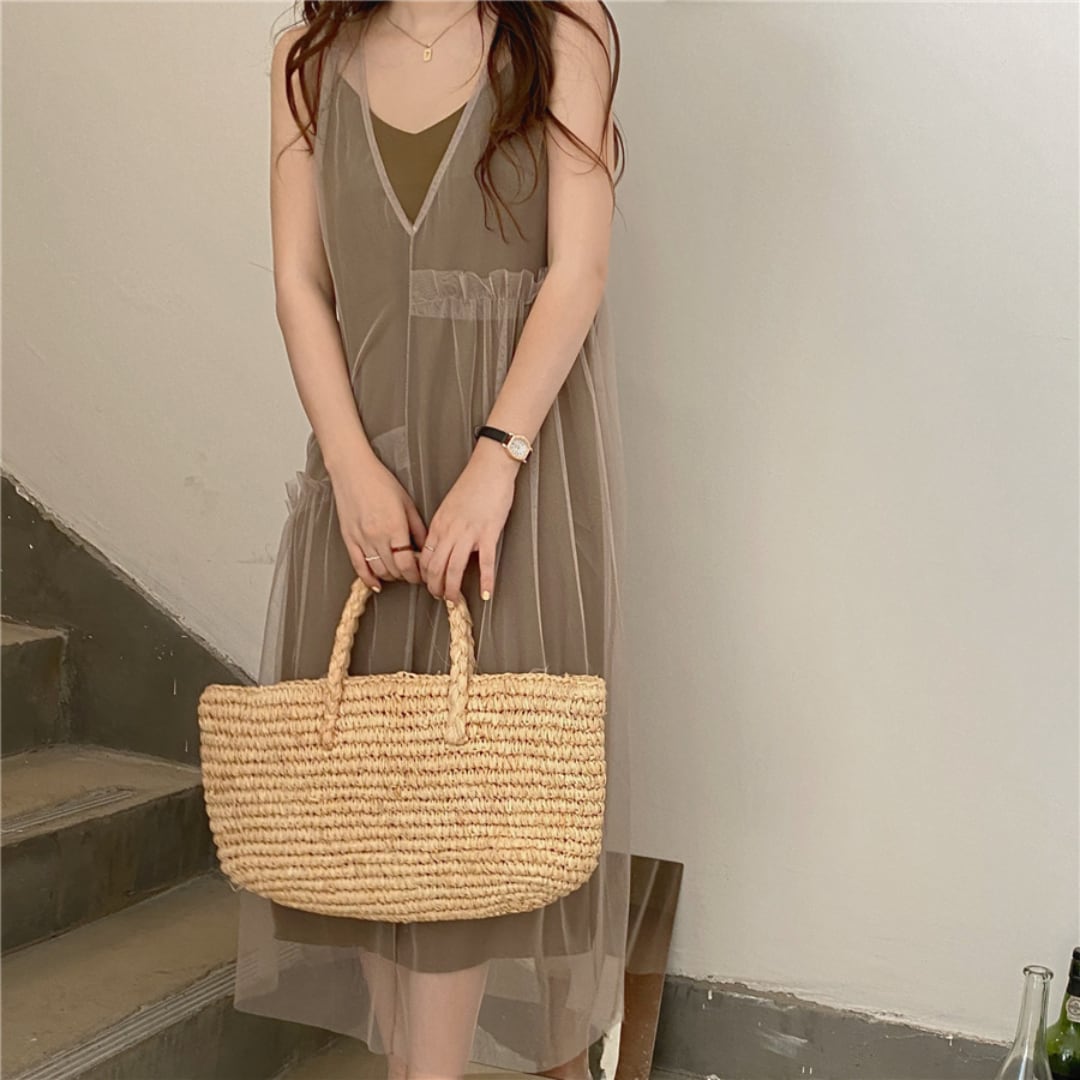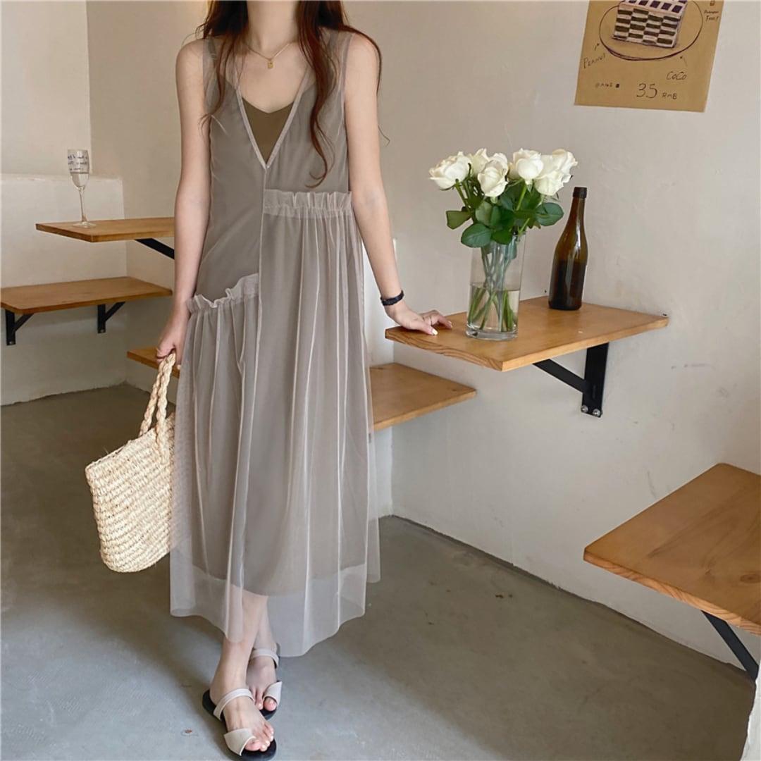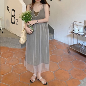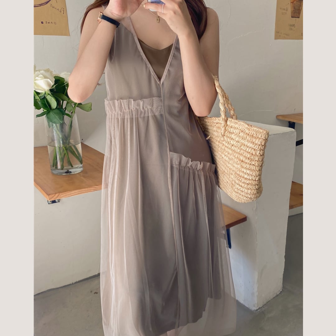 軽やかなチュールオーバーレイが上品さを演出する、ノースリーブワンピース。