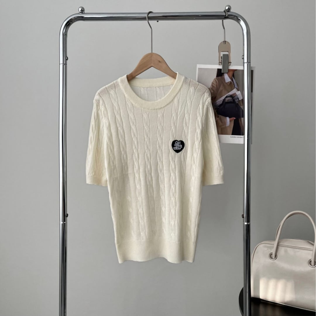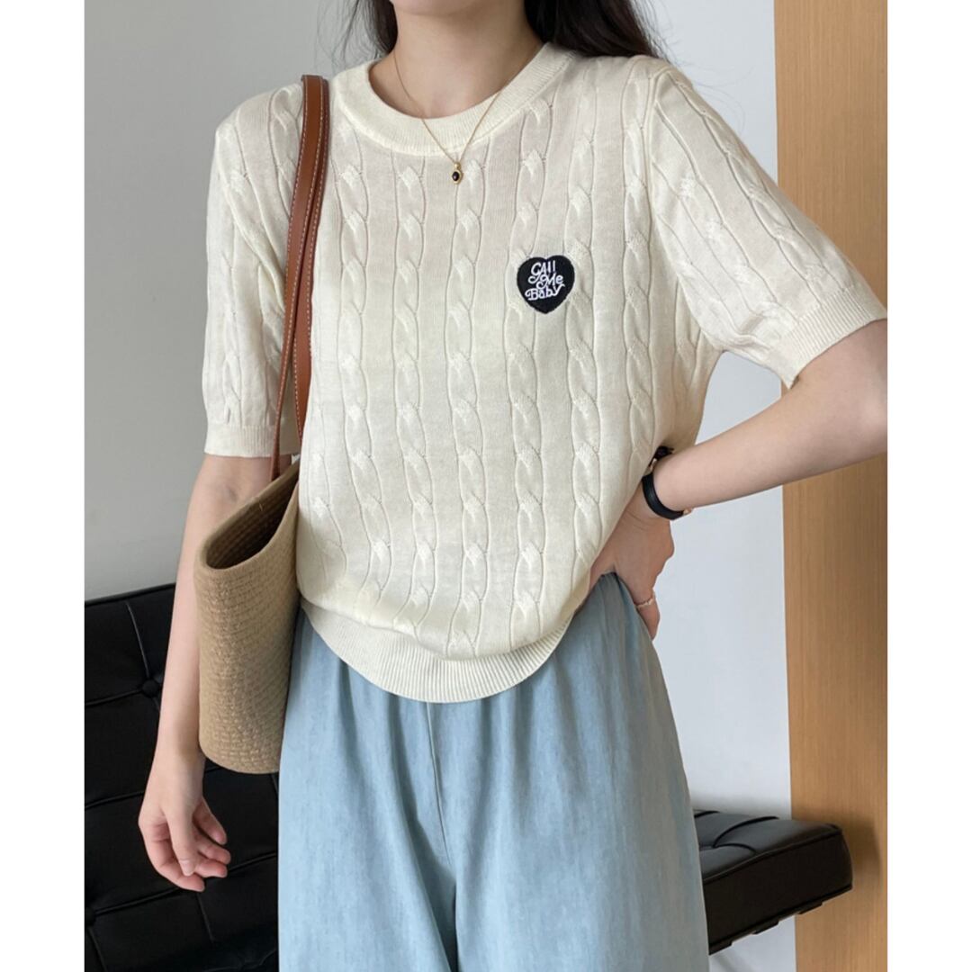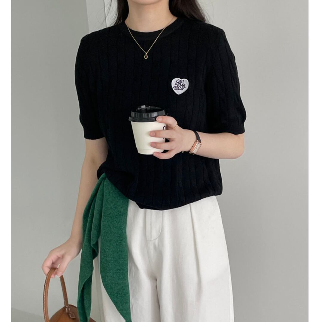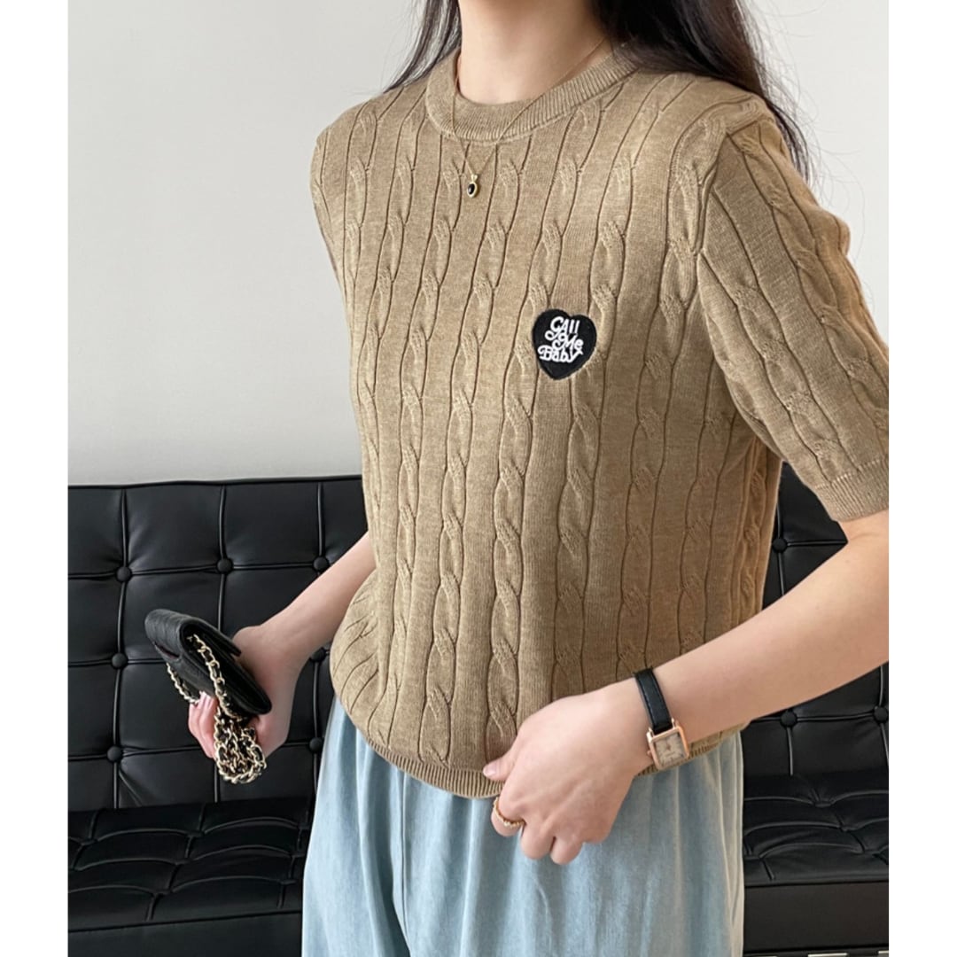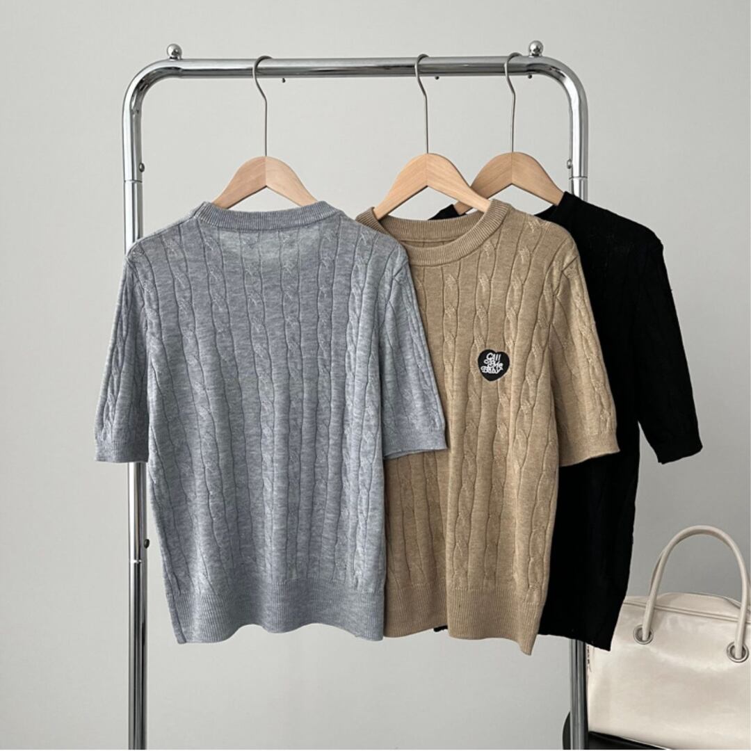 シンプルながらもこだわりが詰まったワンポイントパッチ半袖ニット。