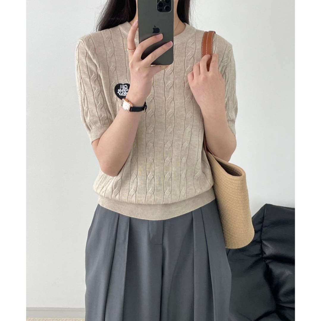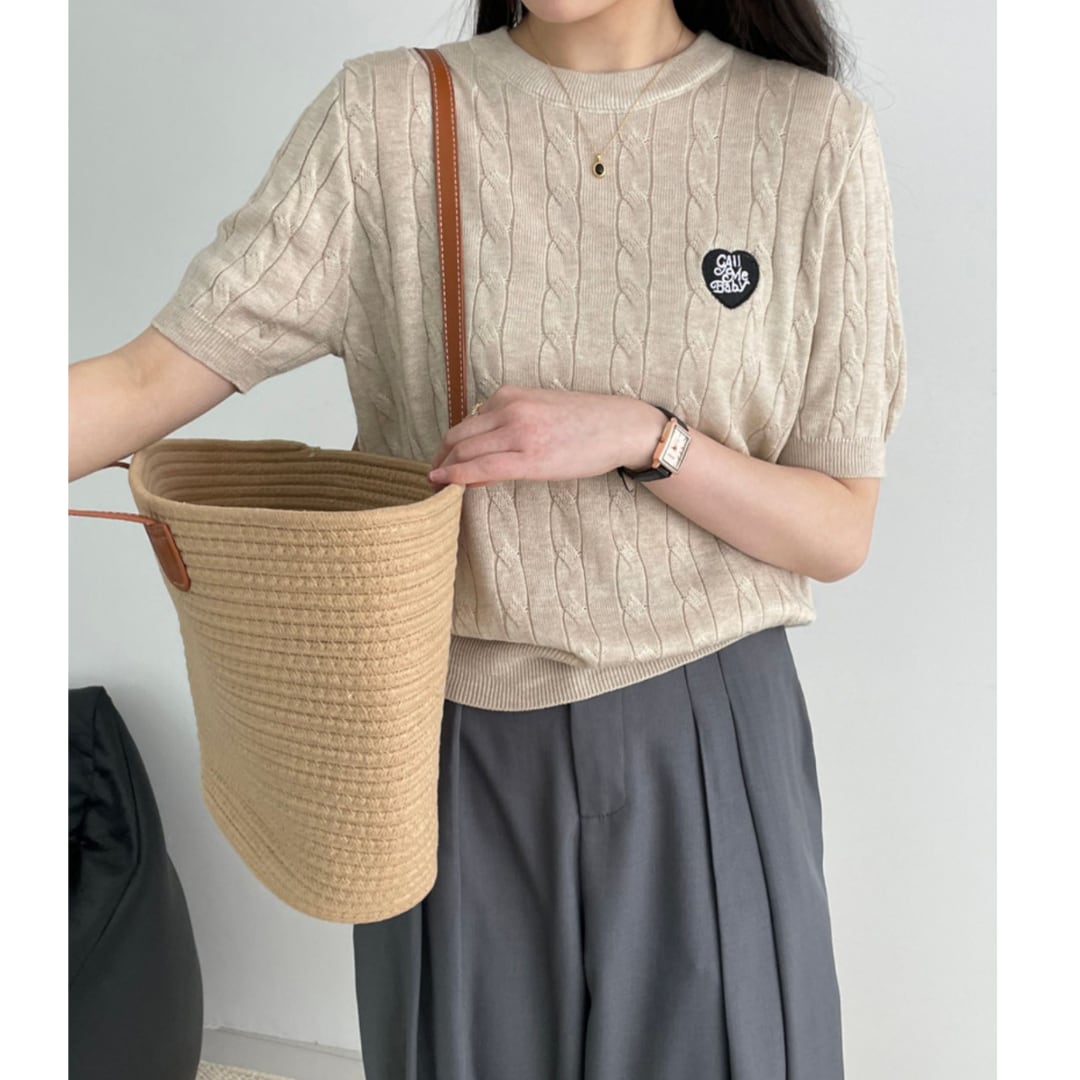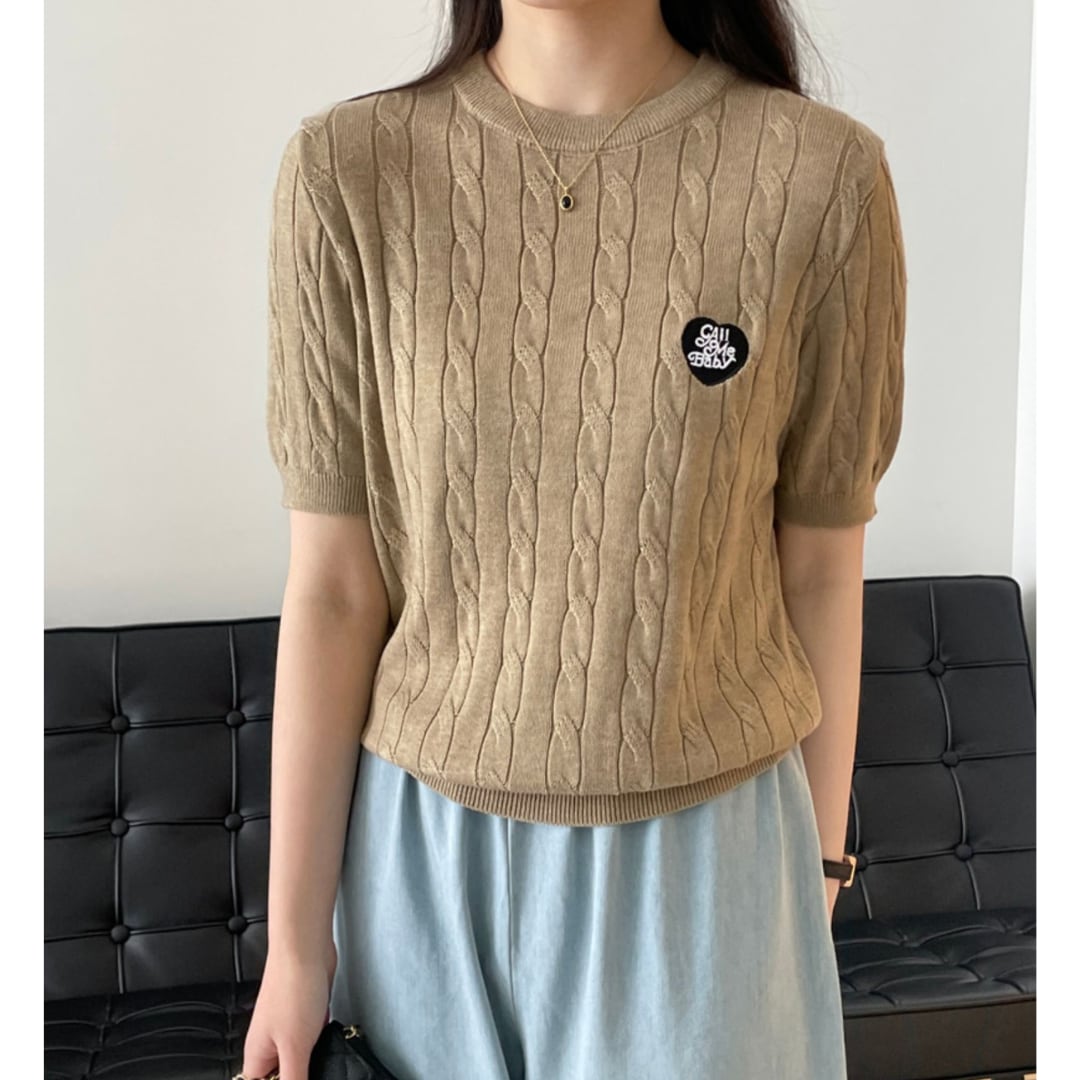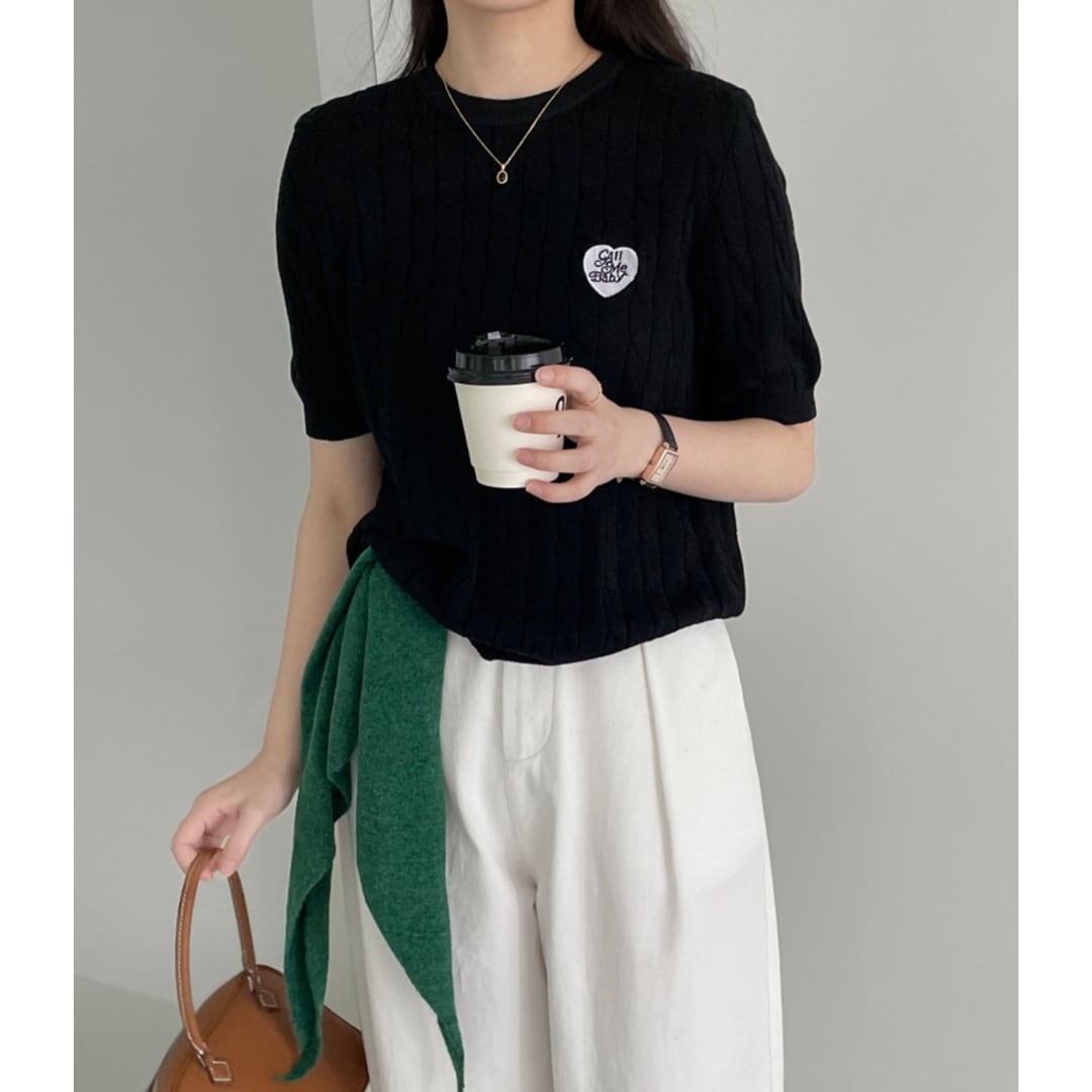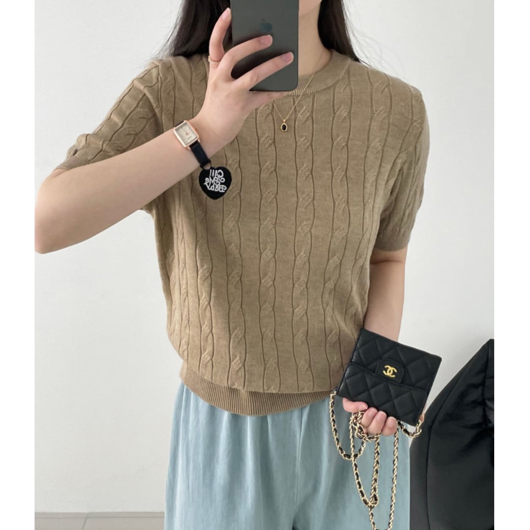 シンプルながらもこだわりが詰まったワンポイントパッチ半袖ニット。