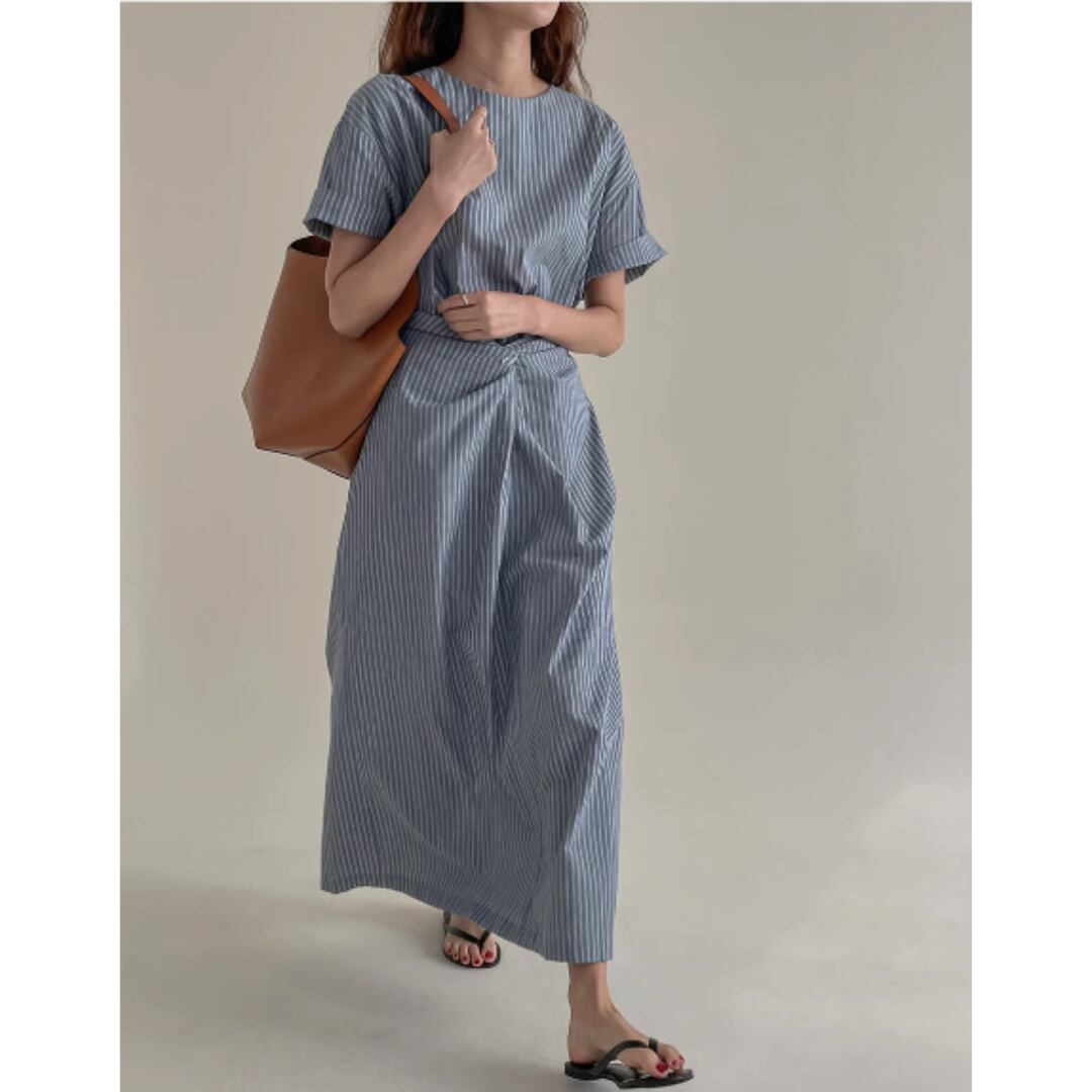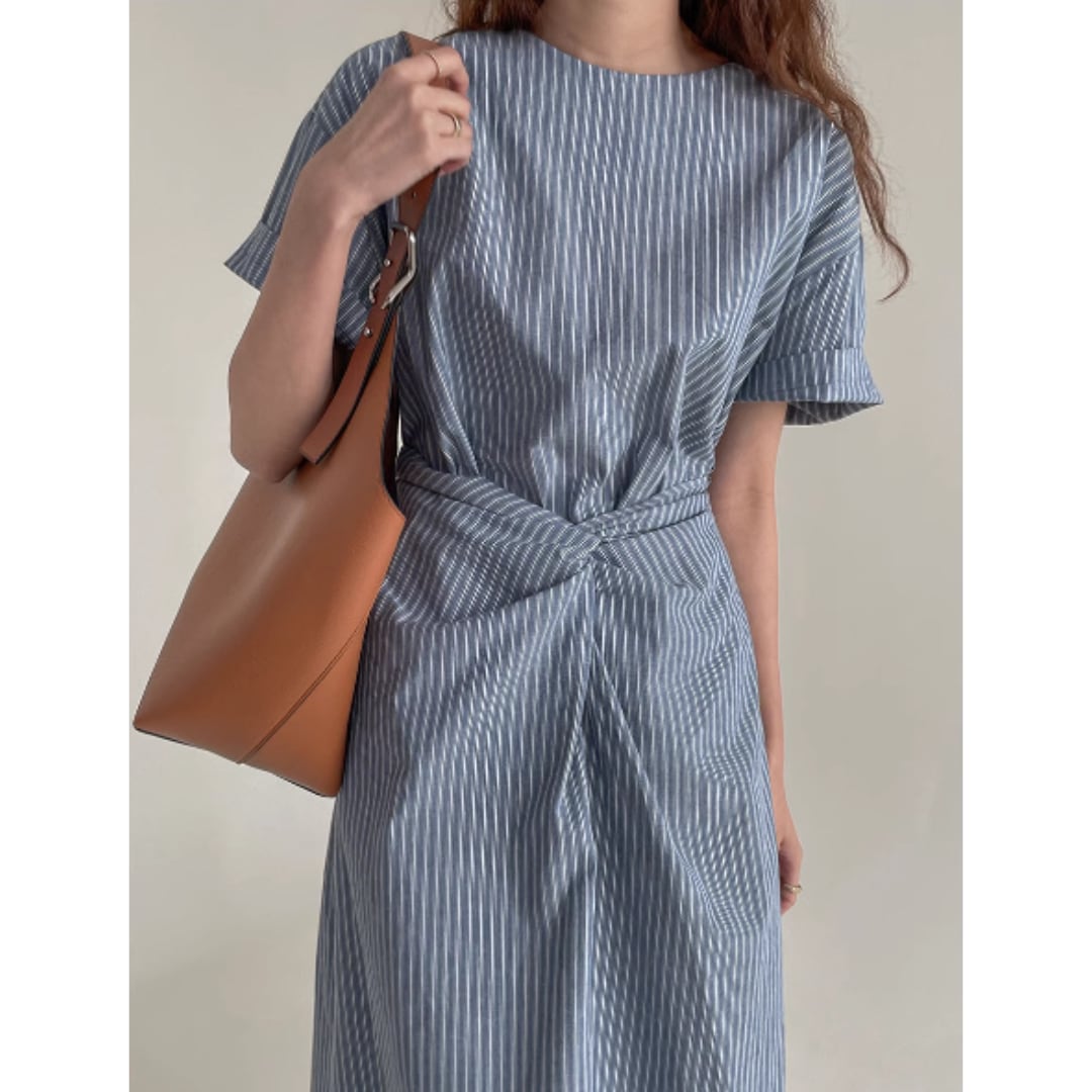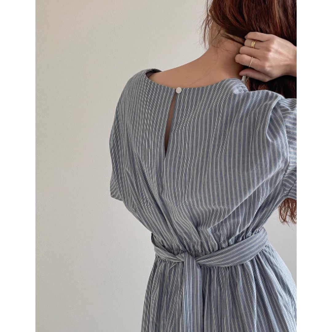 ブルーの爽やかなノーカラー&オールストライプのワンピース。