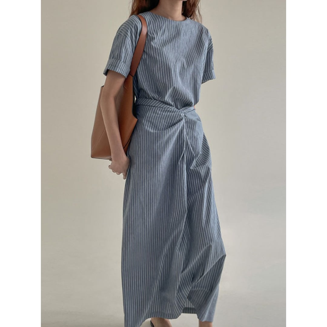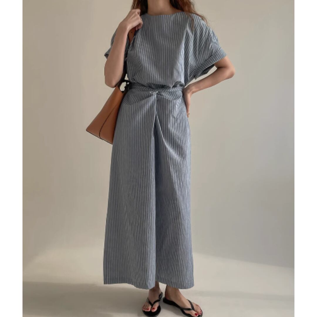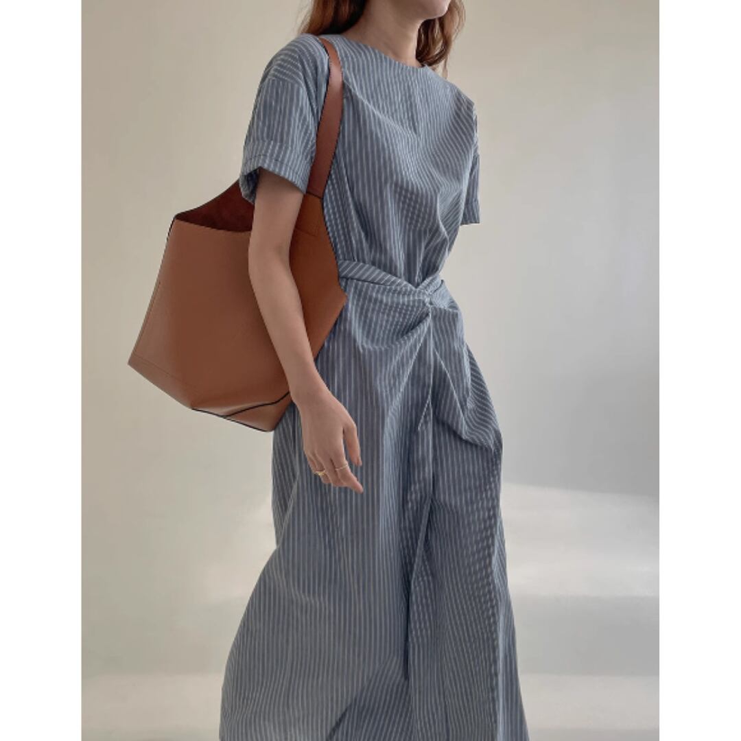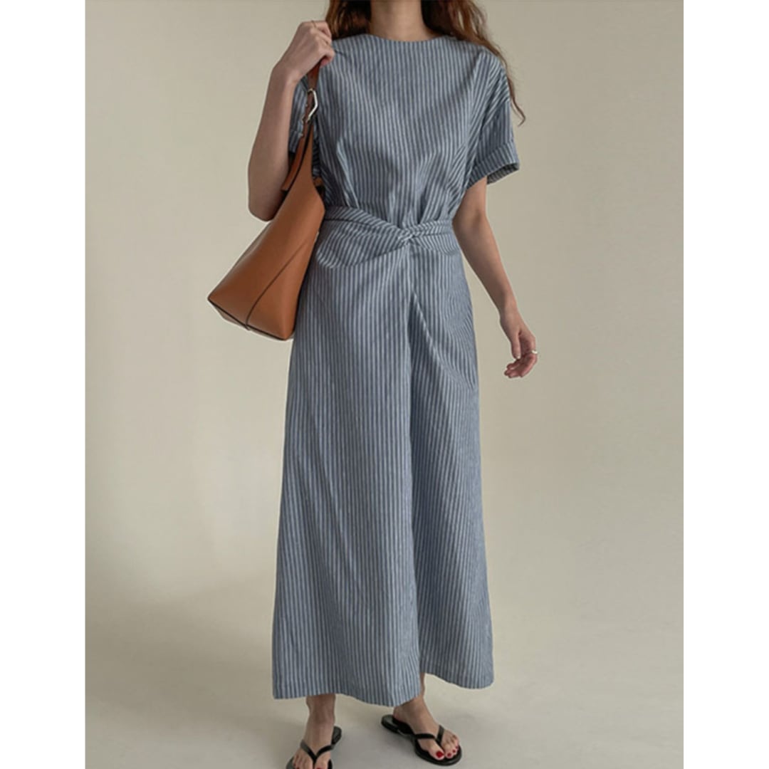 ブルーの爽やかなノーカラー&オールストライプのワンピース。