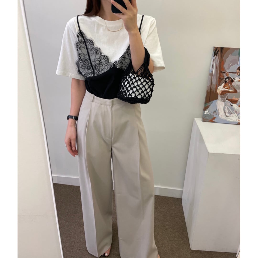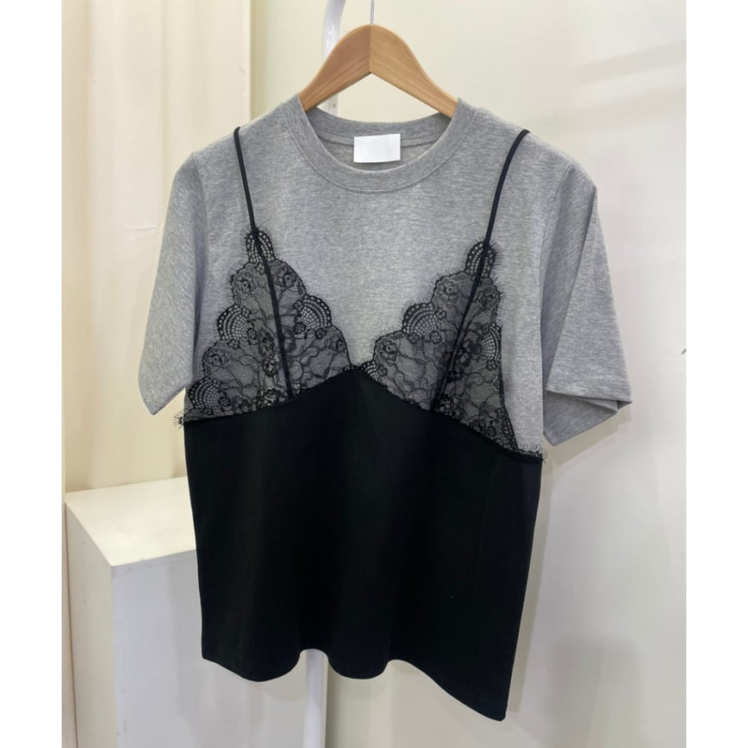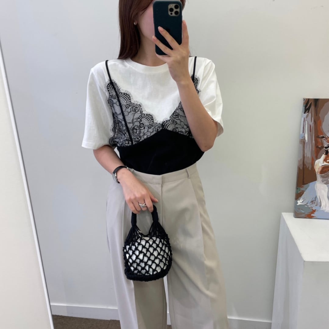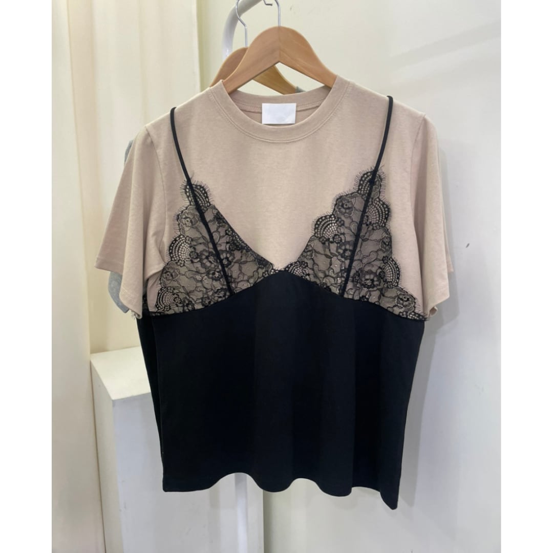 レースキャミをドッキングしたレイヤード風Tシャツ。