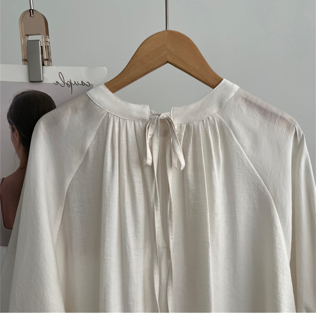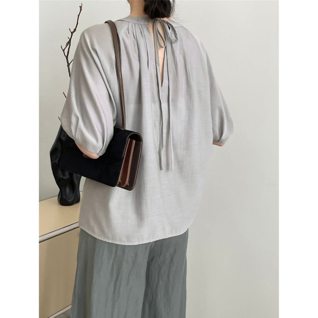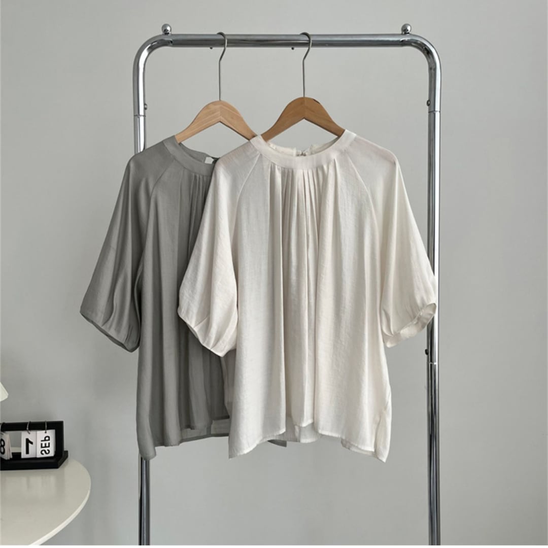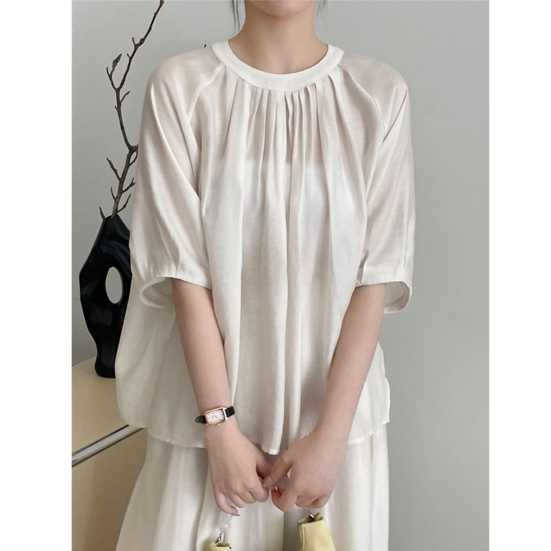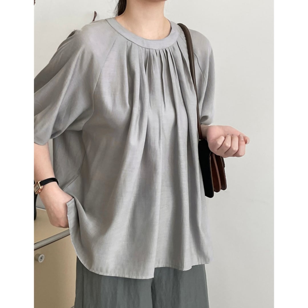 リーツが施されたルーズなシルエットが特徴のハーフスリーブのブラウス。