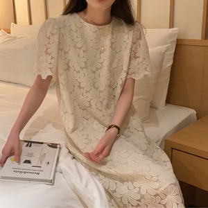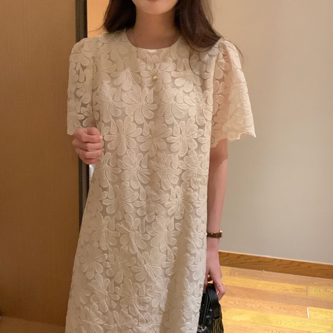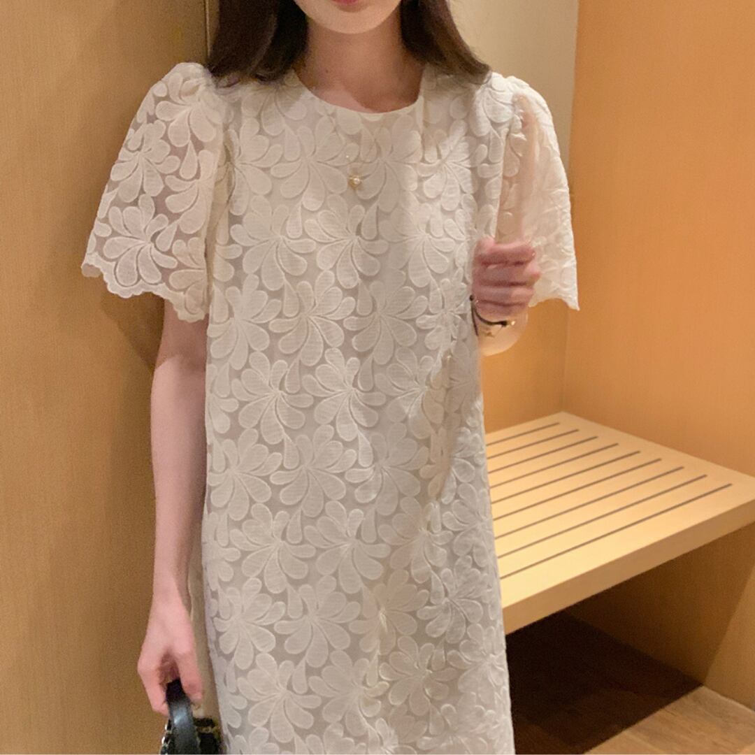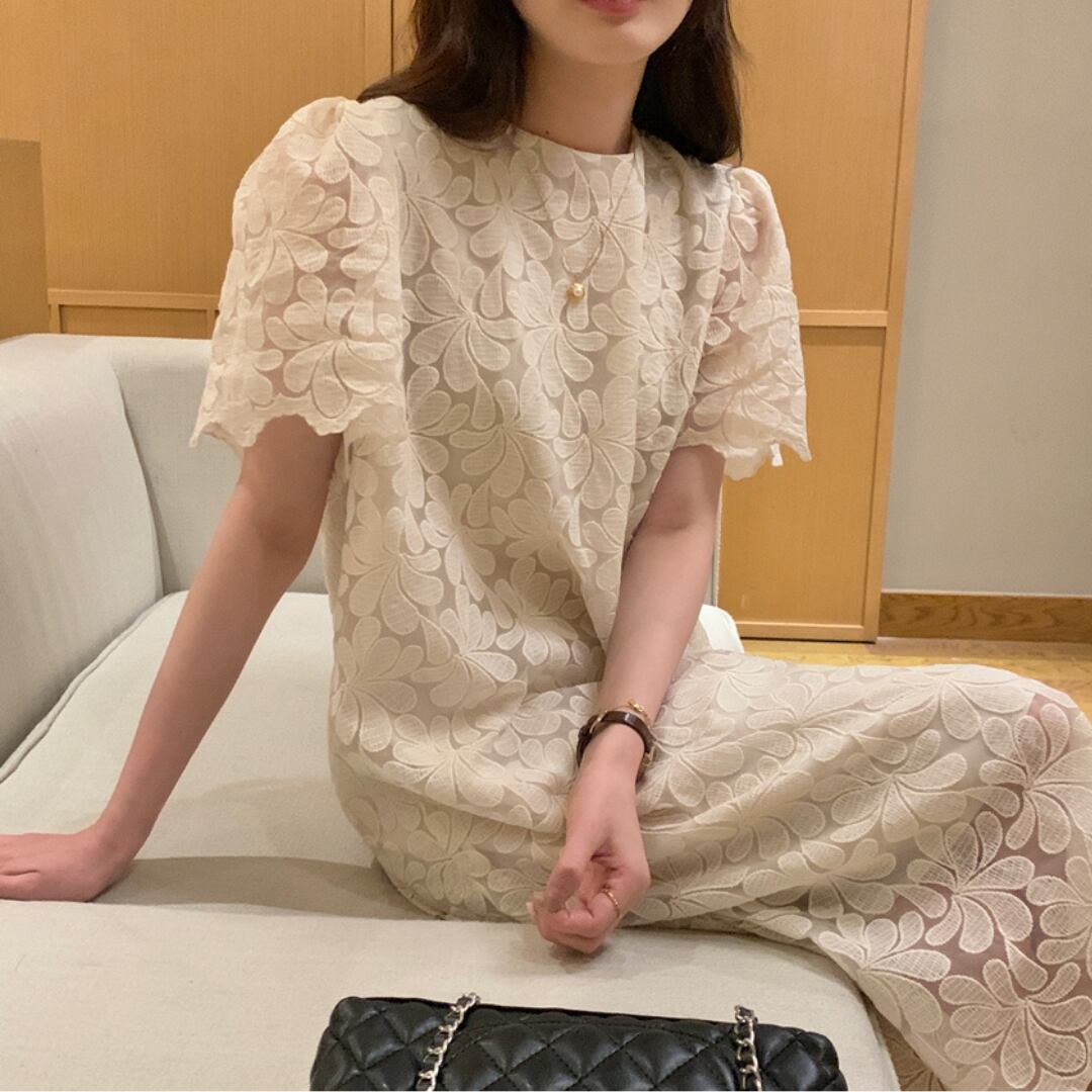 レースの美しさが際立つ、フェミニンな魅力溢れる総レースストレートワンピース。