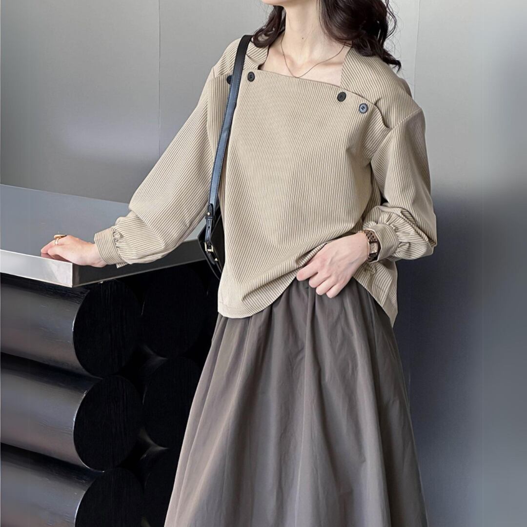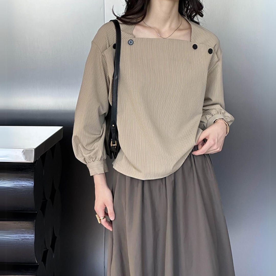 スクエアネックがデコルテを美しく見せ、女性らしさを引き立てる一枚です。