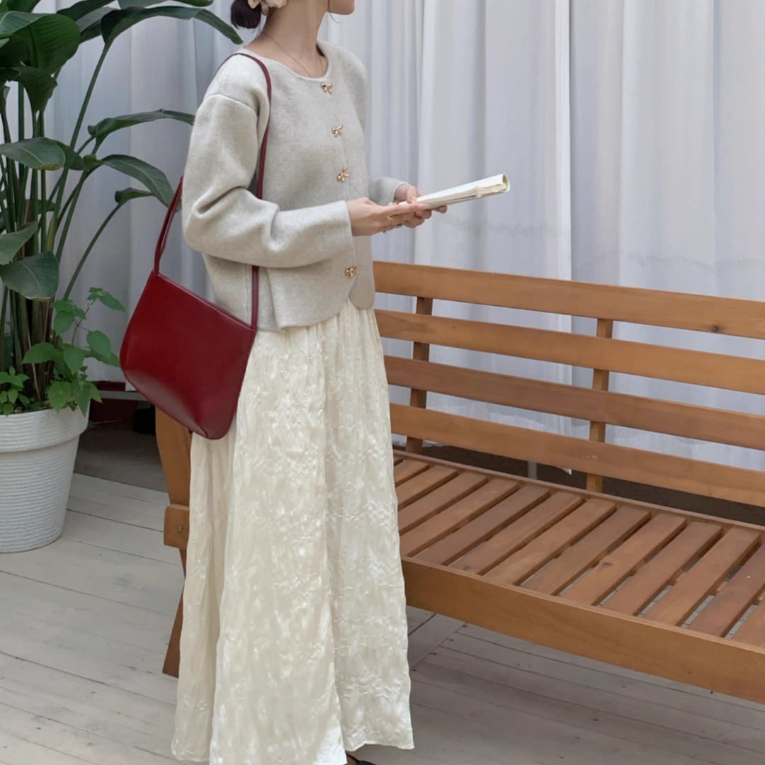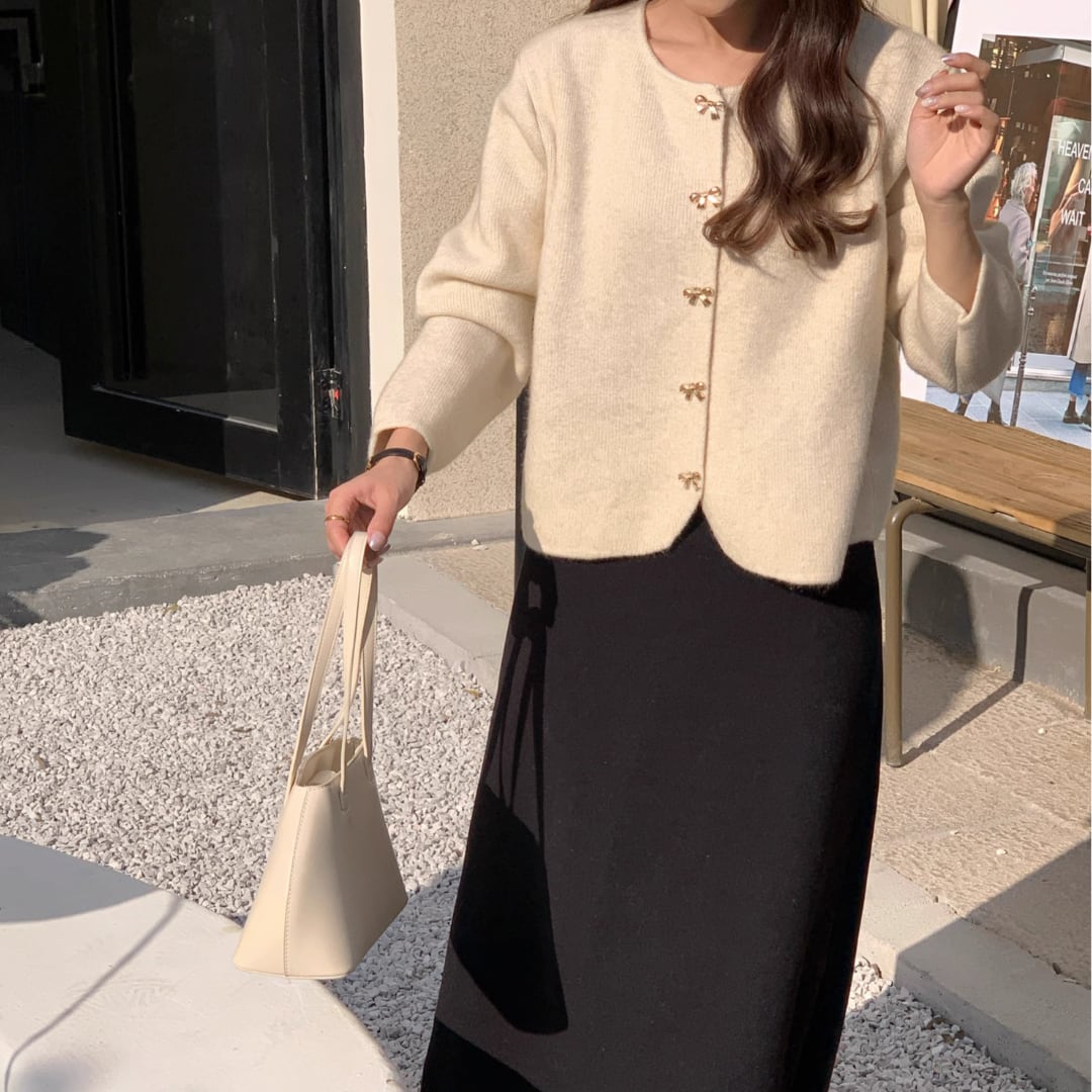 リボンデザインのボタンが愛らしいアクセントを添える上品な一枚です。